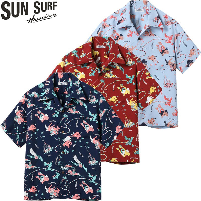 SUN SURF スペシャルエディションは、当時の希少なヴィンテージアロハを綿密に研究し、柄・素材・縫製に至るまで忠実に再現したプレミアムコレクションです。アート性の高いハワイアンモチーフや、日本の職人による精緻なプリント技法は、まさに“着るヴィンテージアート”。生地にはレーヨン羽二重など当時の仕様を再現したものを採用し、滑らかな肌触りと美しいドレープ感を実現しています。