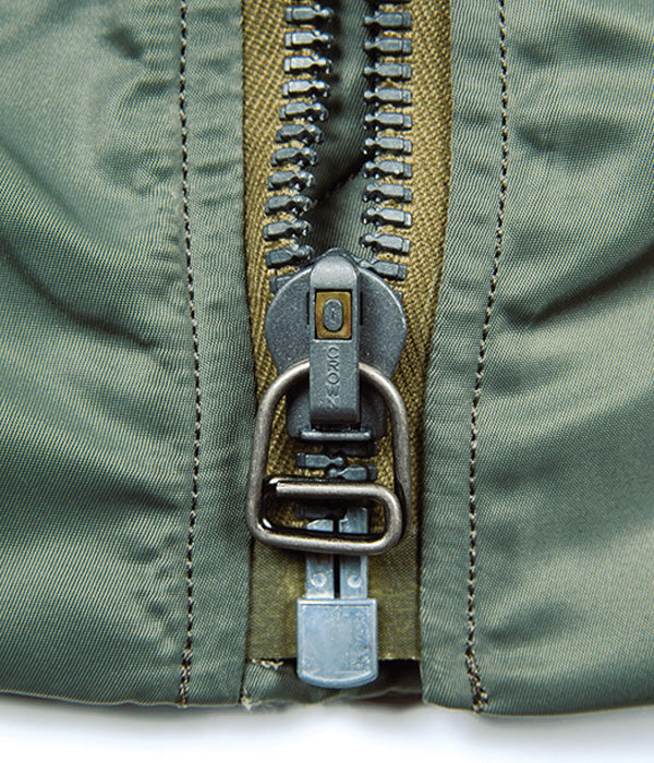 Zippers are among the most critical elements of the MA-1 jacket. Depending on the contractor and the production period, the zippers used could vary, but the CROWN zippers were particularly notable for their unique design. These zippers featured a spring-cam lock mechanism that automatically locked the zipper in place when the slider was released. The large pull tab, designed for easy use even with gloves, added a practical touch. Although CROWN zippers were eventually replaced by more cost-effective alternatives in the late 1960s, they remain a sought-after feature in vintage and reproduction jackets. The MIL-J-8279D model introduced a reversible zipper, with pull tabs on both sides for ease of use.