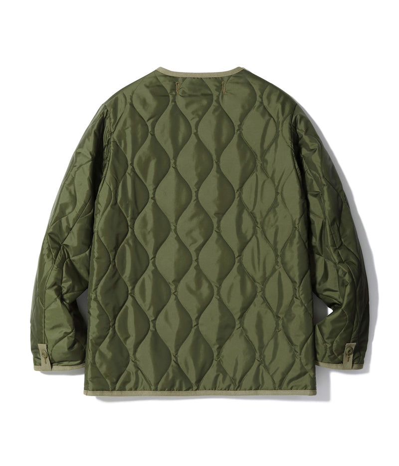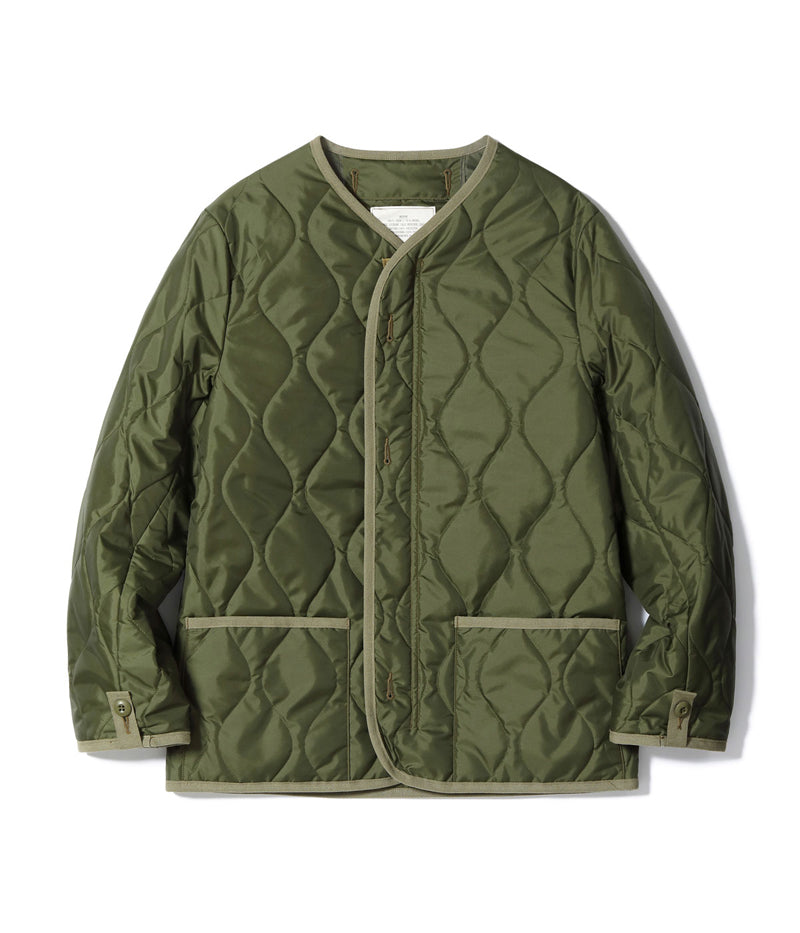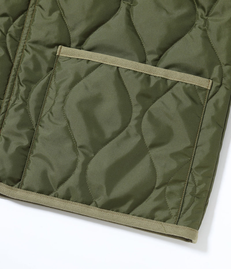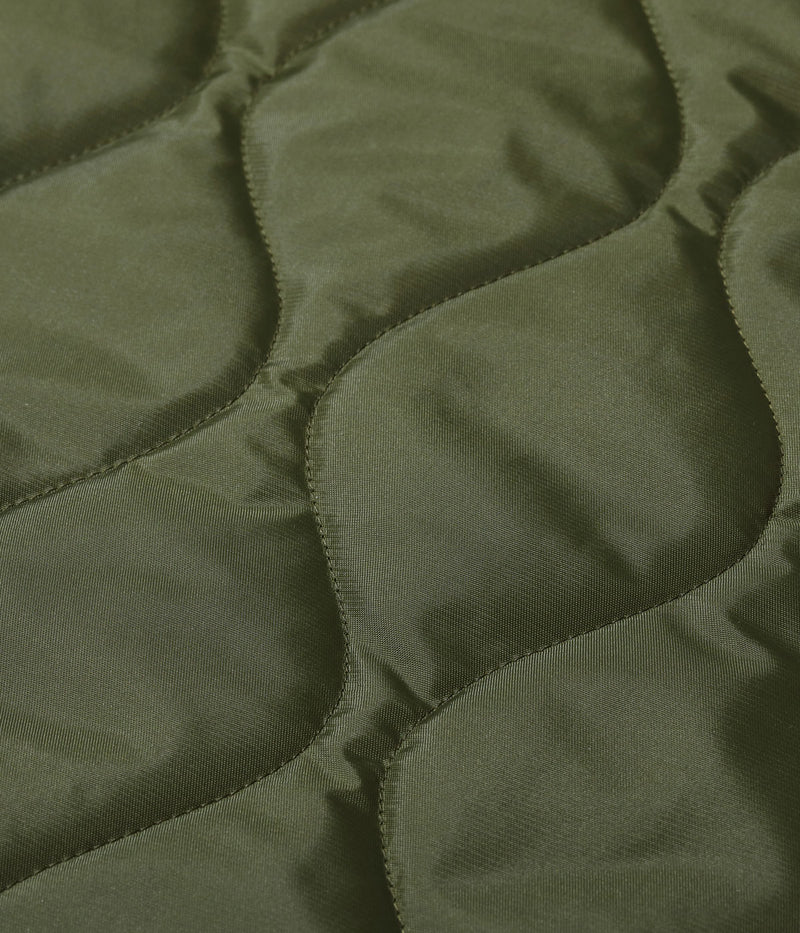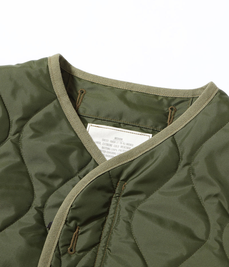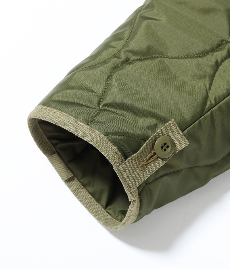 The M-65 field jacket came with an exclusive liner to better protect soldiers from the cold. By quilting the padded fabric, the lining was made dramatically lighter and warmer compared to previous alpaca and wool liners. It also uses wave stitch to prevent the padding from slipping. The liner has buttonholes on the neck, cuffs, and front edges to attach to the buttons on the field jacket’ s interior. While a conventional M-65 liner is designed exclusively for fly front closure jackets and thus cannot be worn by itself, this liner has a zipper and other modified specs so that it can also be worn by itself.