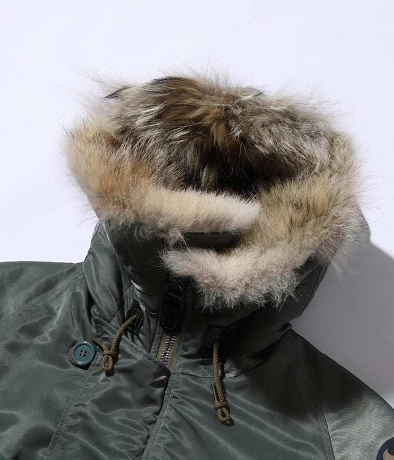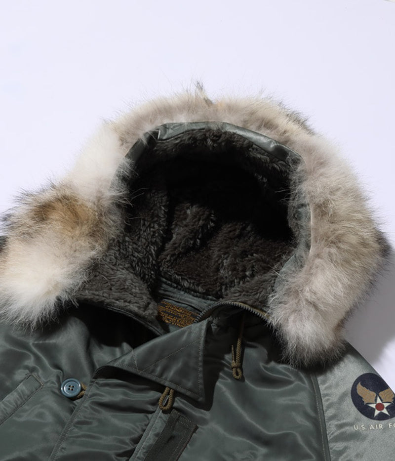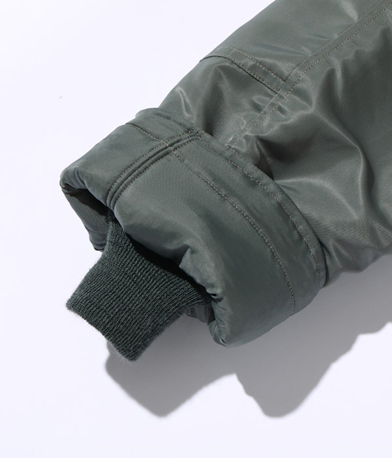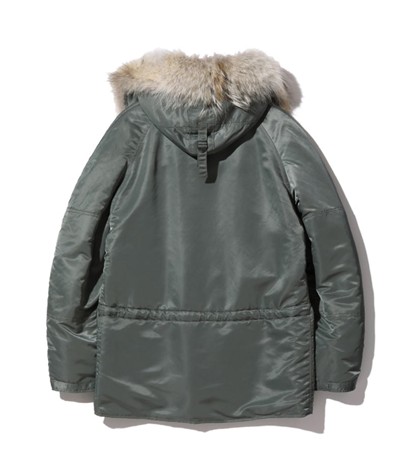 The color of the N-3B was changed to sage green from Air Force blue of its predecessor model, the N-3A. The layer of nylon twill was also modified from 3/1 weave to 2/2 weave. In addition, the sleeve with exterior rib-knit was changed to inner rib-knit to shut out outside air. The front wind f lap reaches the waist, and the waist adjuster drawstring was moved from the jacket’ s exterior to its interior so as not to become an interference.