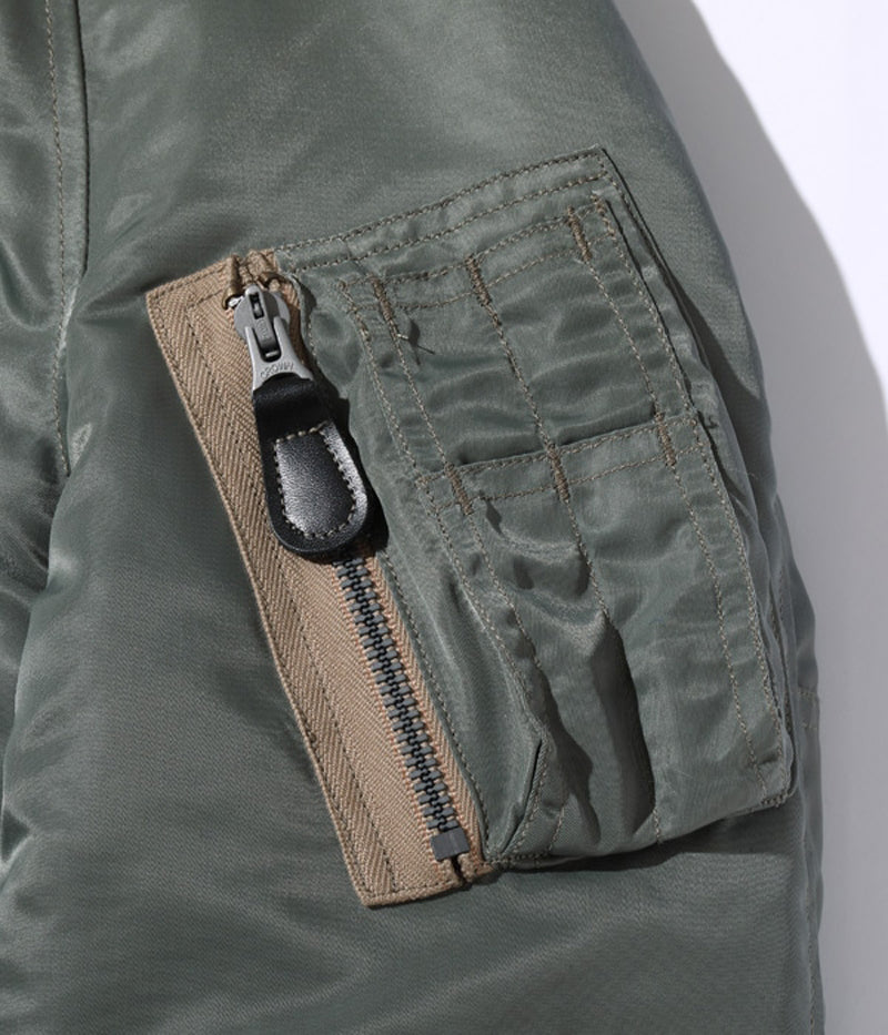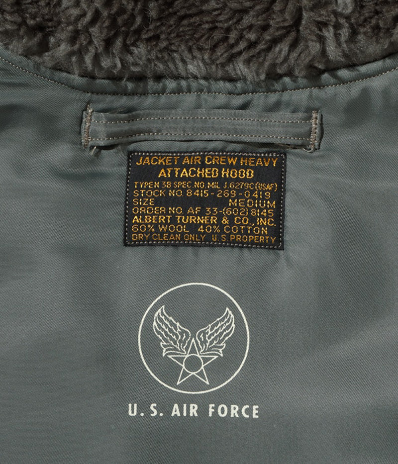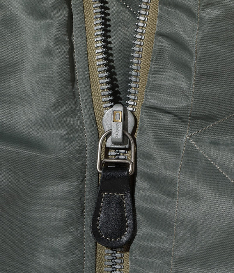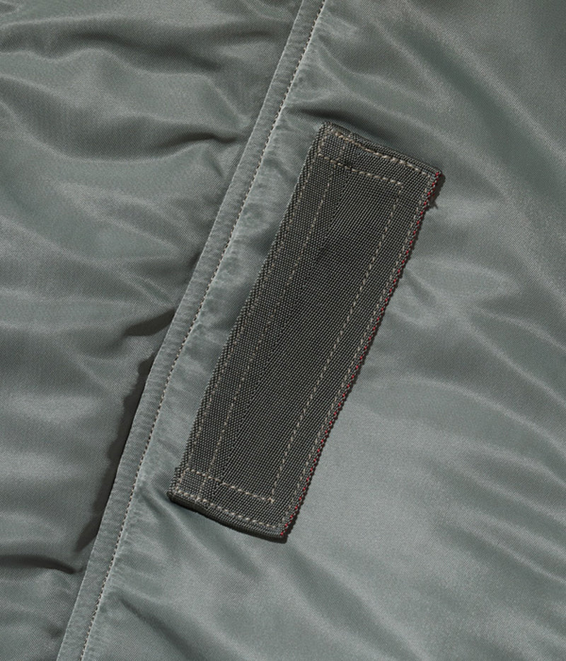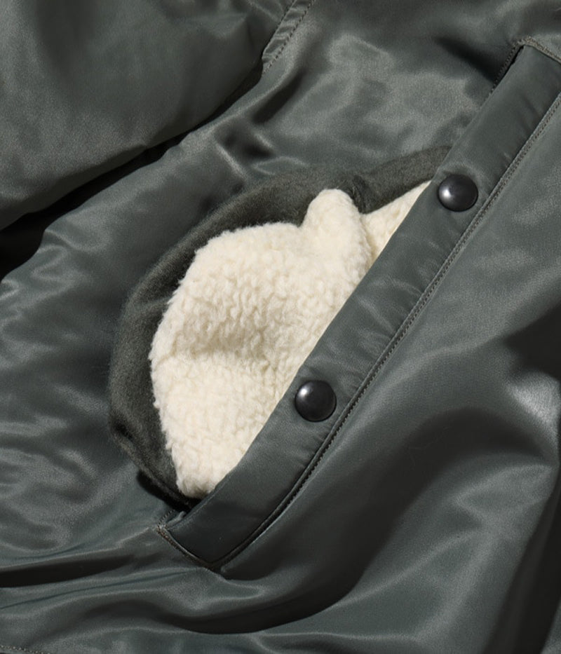 The color of the N-3B was changed to sage green from Air Force blue of its predecessor model, the N-3A. The layer of nylon twill was also modified from 3/1 weave to 2/2 weave. In addition, the sleeve with exterior rib-knit was changed to inner rib-knit to shut out outside air. The front wind f lap reaches the waist, and the waist adjuster drawstring was moved from the jacket’ s exterior to its interior so as not to become an interference.