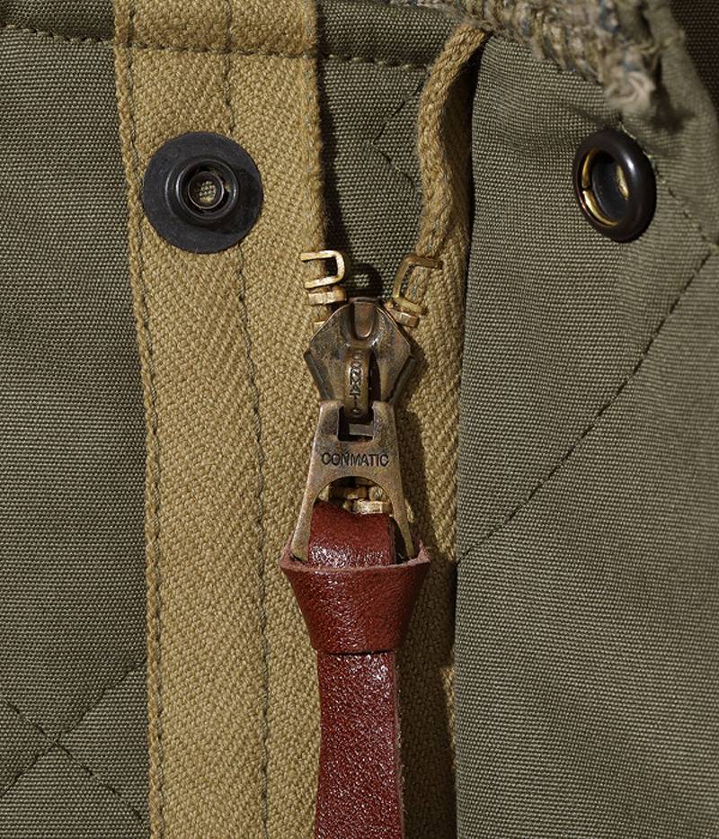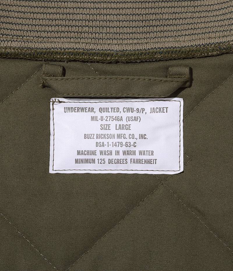 | The CWU-9/P, a quilted type with padding, is a rare liner jacket, which was adopted in the early 1960s as a liner for the CWU-7/P. Although intended to be used as a liner, it can also be worn on its own due to the dual construction of the zipper and snap buttons on the front. Originally, there was only a chest pocket, but a patch pocket was added later for more functionality. This jacket is the lightest of those classified as flight jackets and has a wide range of uses as both inner and outerwear, as it also offers a moderate degree of warmth. This liner was originally made of nylon, but the Buzz Rickson’s version is made of cotton. | |||||||||||||||||||||||||||||||||||||