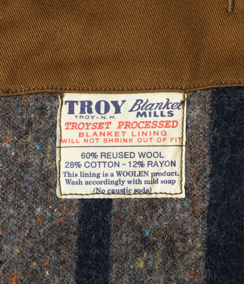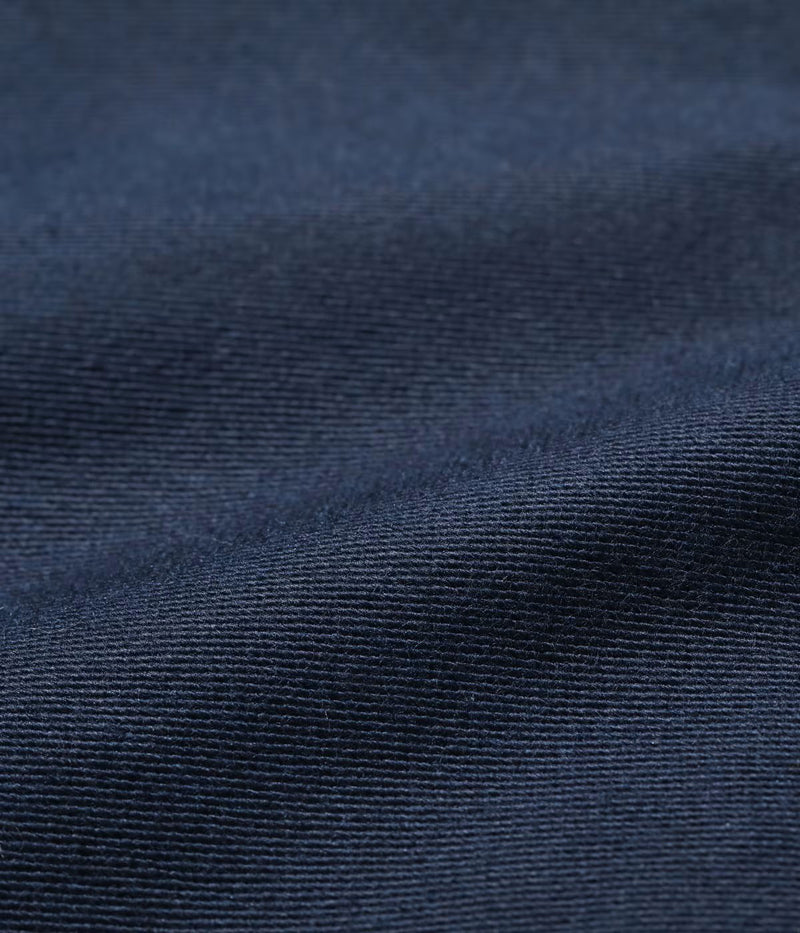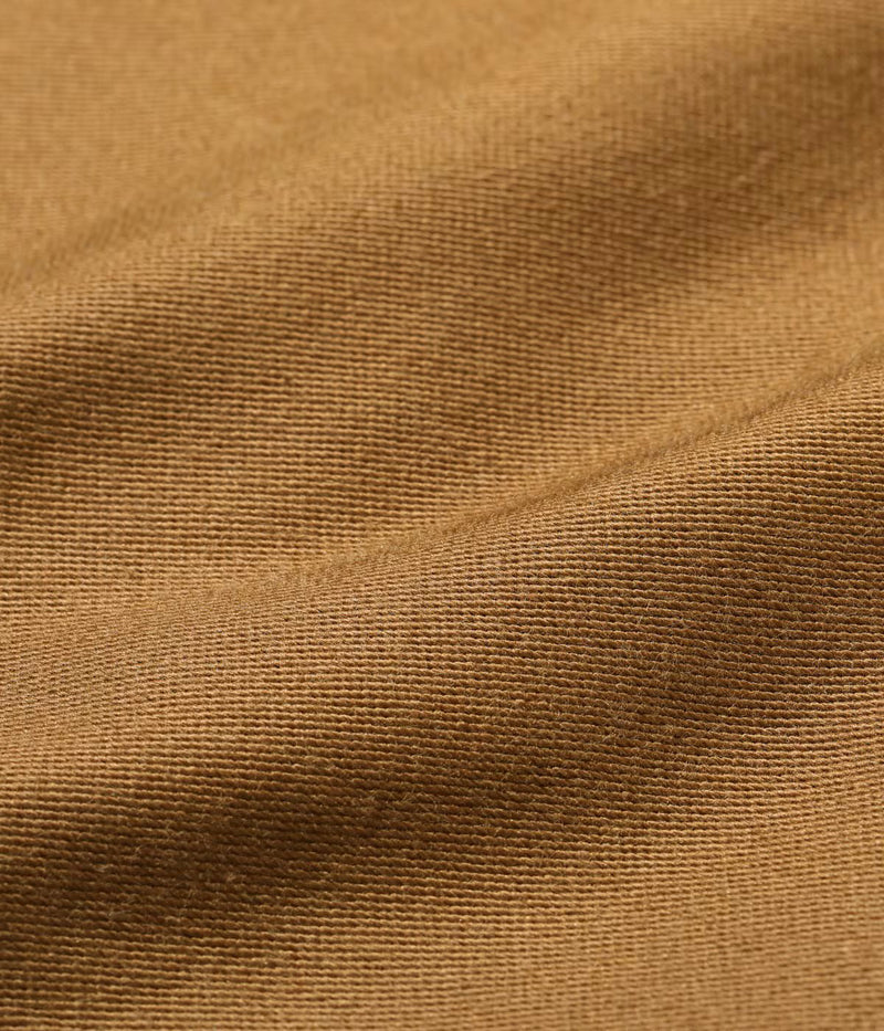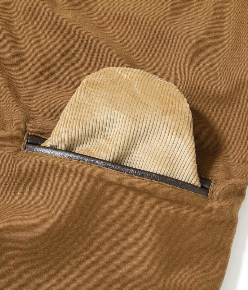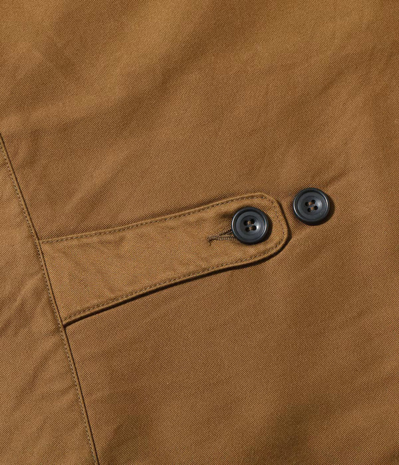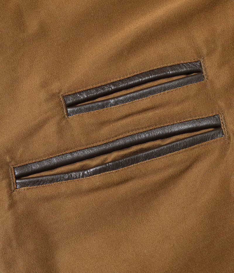 A work jacket made with moleskin, which was widely used as workwear fabric in the U.S. during the 1930s and 1940s. The four welted pockets are reinforced with horsehide. The main "Giant Tag" reflects those found on workwear and sportswear of the era. Waist adjustment is possible via tabs and buttons on both sides of the back. A small change pocket at the right waist is a unique Sugar Cane addition.