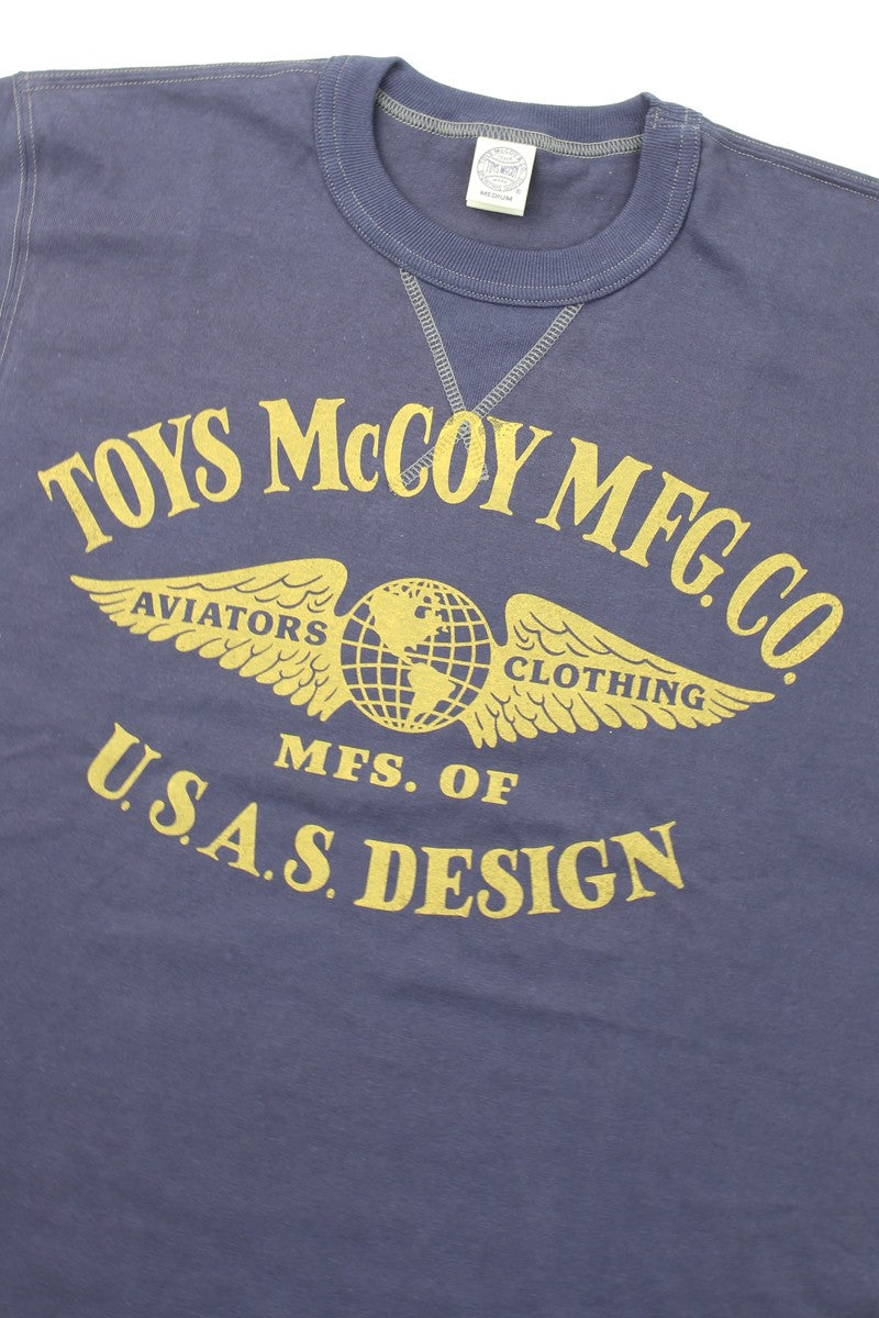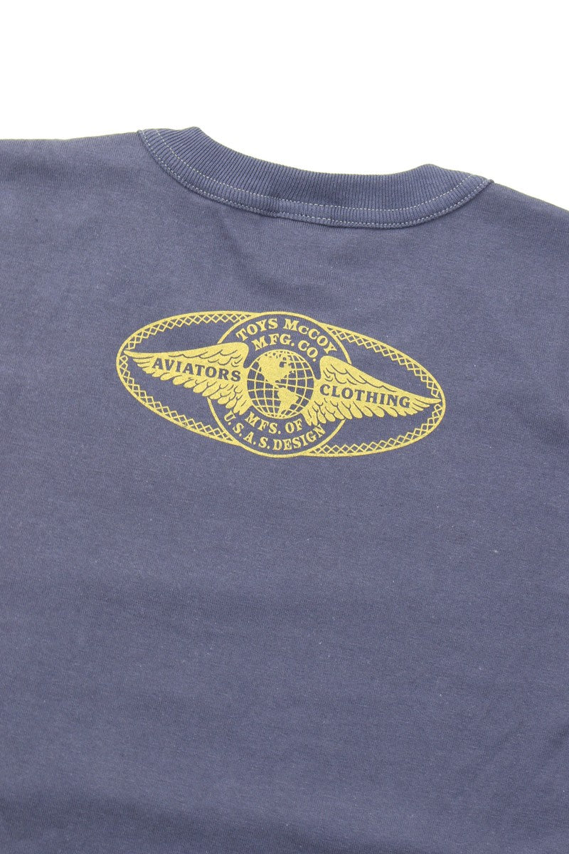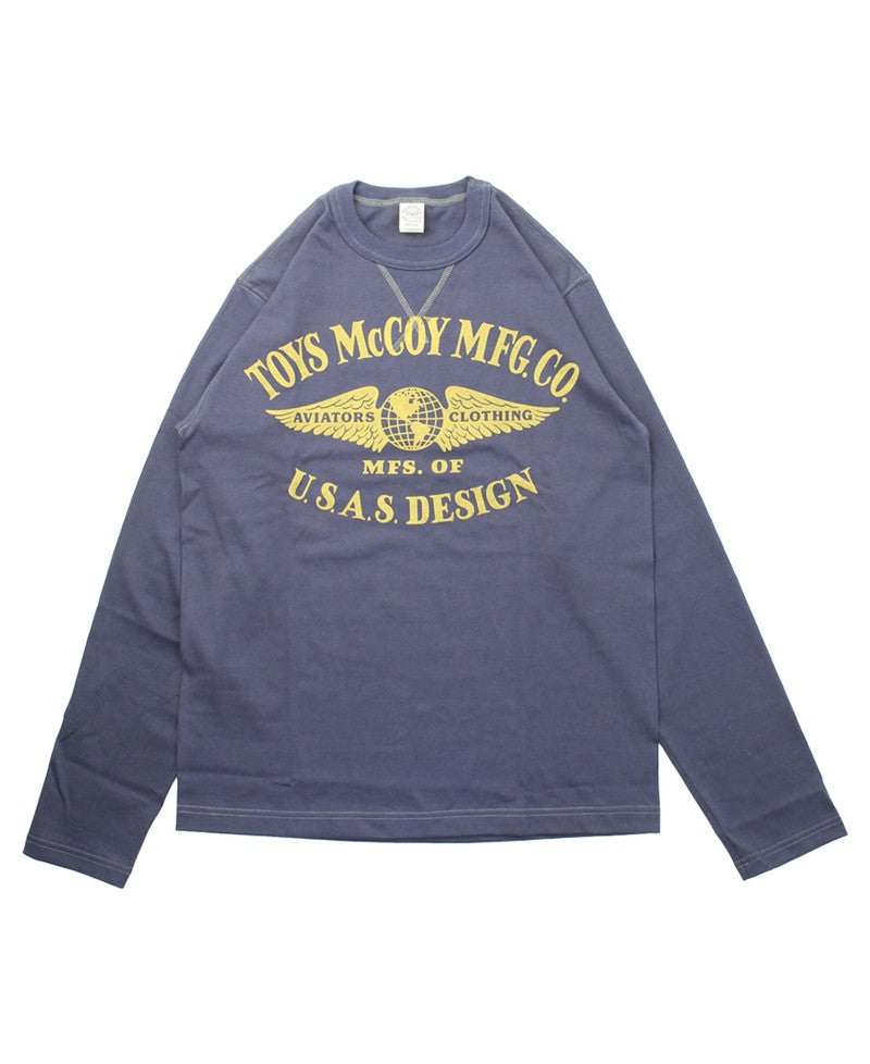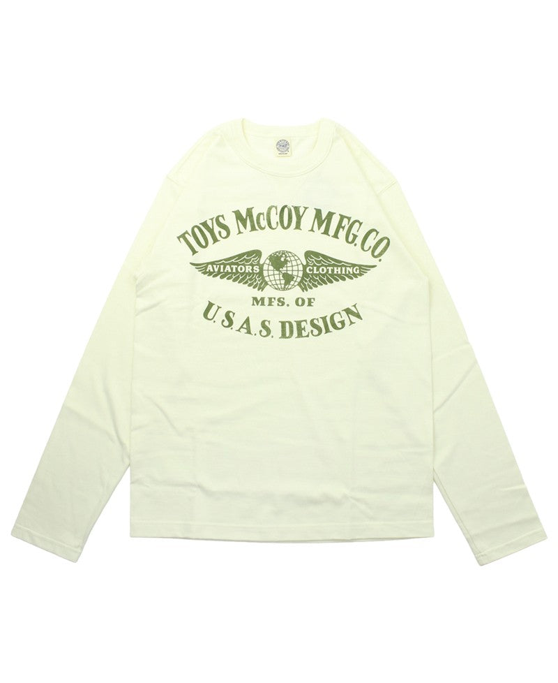 A long-sleeve T-shirt from TOYS McCOY MFG. CO., built on a fictional backstory about a company that has supplied aviation gear to U.S. Army, Navy, and Air Force squadrons since the pre-war era. The winged-globe logo is one that hardcore aficionados will recognize.