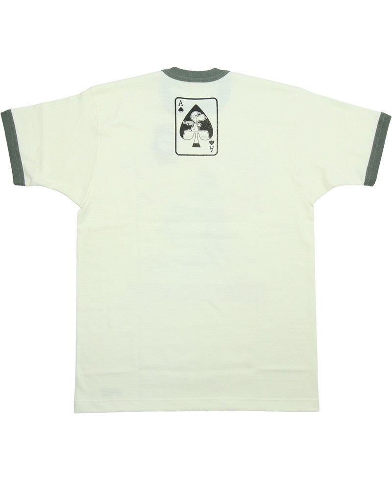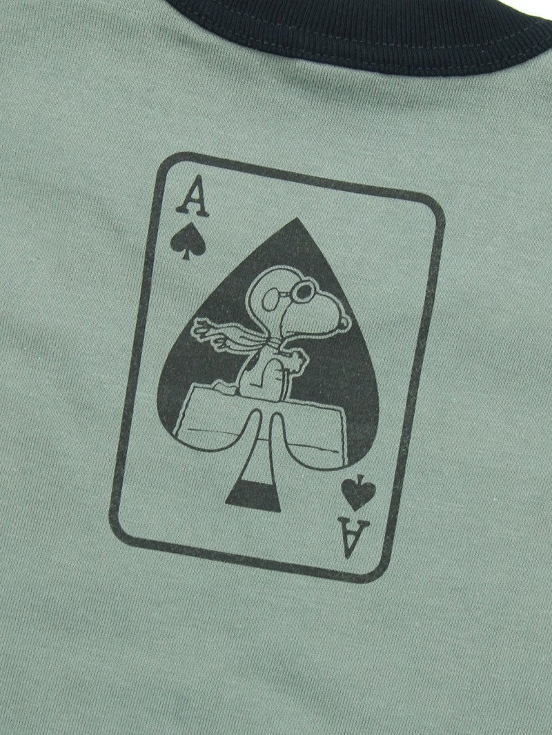 A ringer T-shirt featuring Snoopy dressed as Lieutenant Colonel Kilgore—the larger-than-life character from *Apocalypse Now*. Those familiar with the film will recall the distinctive surfboard motif that left a lasting impression. At the center of the design, Snoopy appears as the Flying Ace, framed within the Ace of Spades—an emblematic detail that will resonate with those who recognize its deeper reference.
