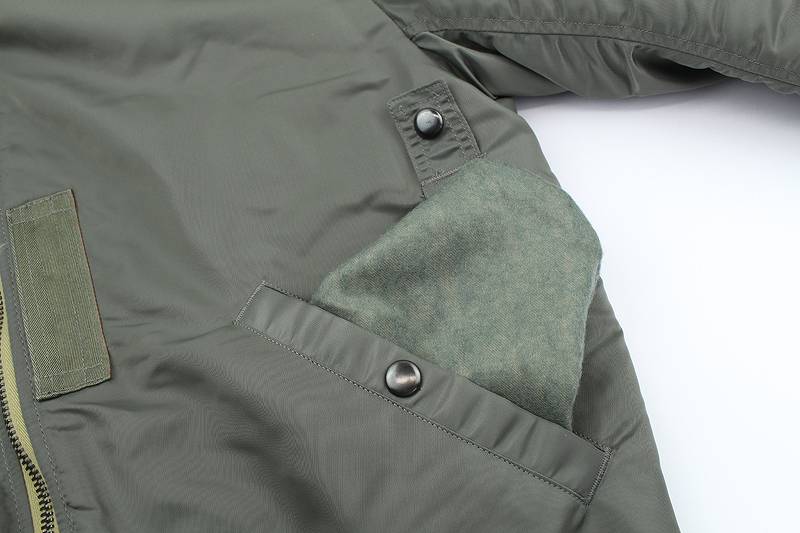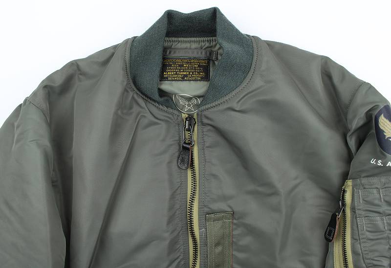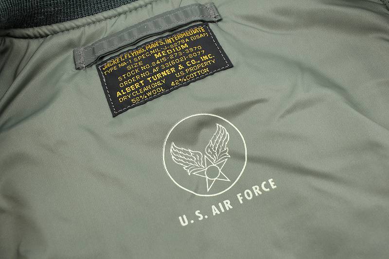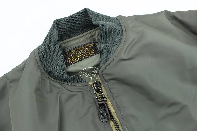 | This MA-1 is a complete reissue of "MIL-J-8279A" bearing the real name label of "ALBERTURNER", a contractor who delivered many nylon flight suits. The outer shell is also reproduced in its original grayish color with the same material as the early MA-1. | |||||||||||||||||||||||||||||||||||