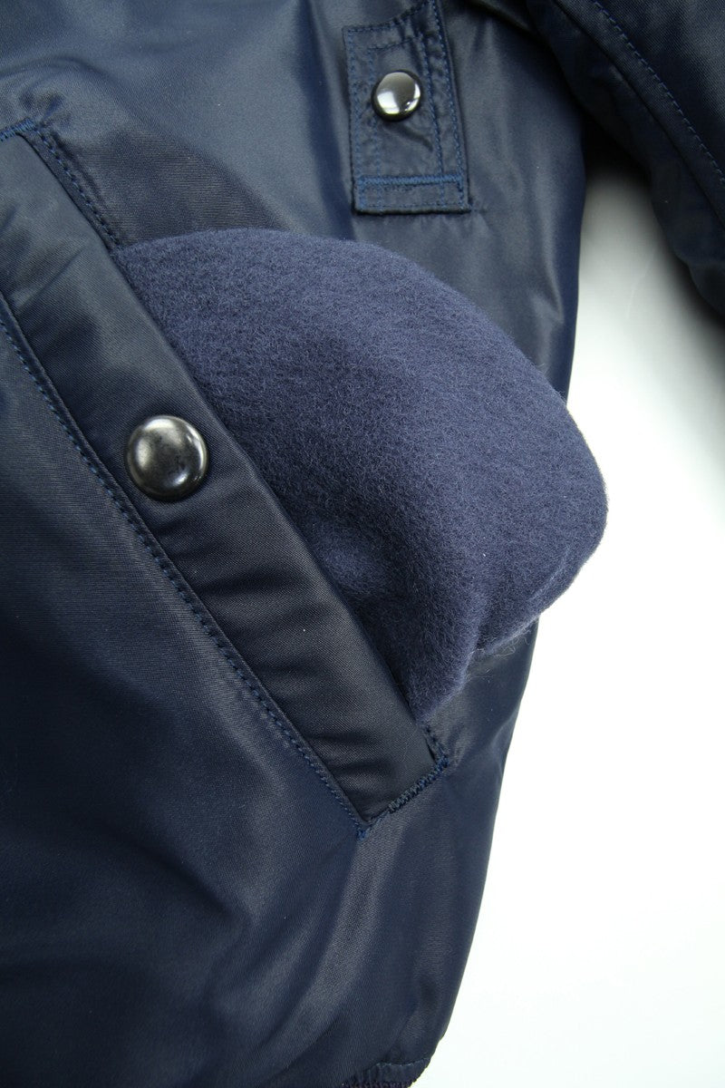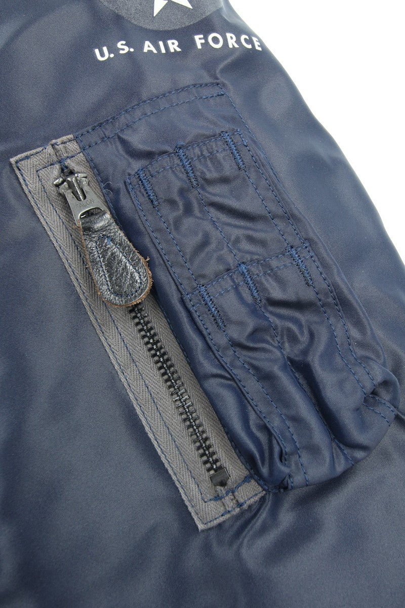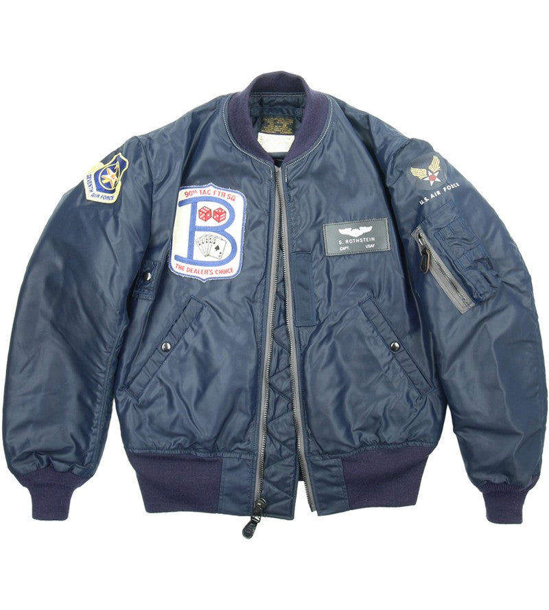 This reproduction of the B-15C (mod) follows the 1956 Technical Order “14P3-10-501,” in which the original mouton fur collar was modified to a wool rib-knit version. The jacket is customized with the image of a crew member from the 90th Bombardment Squadron (90 TAC), a unit that was once stationed in Japan.