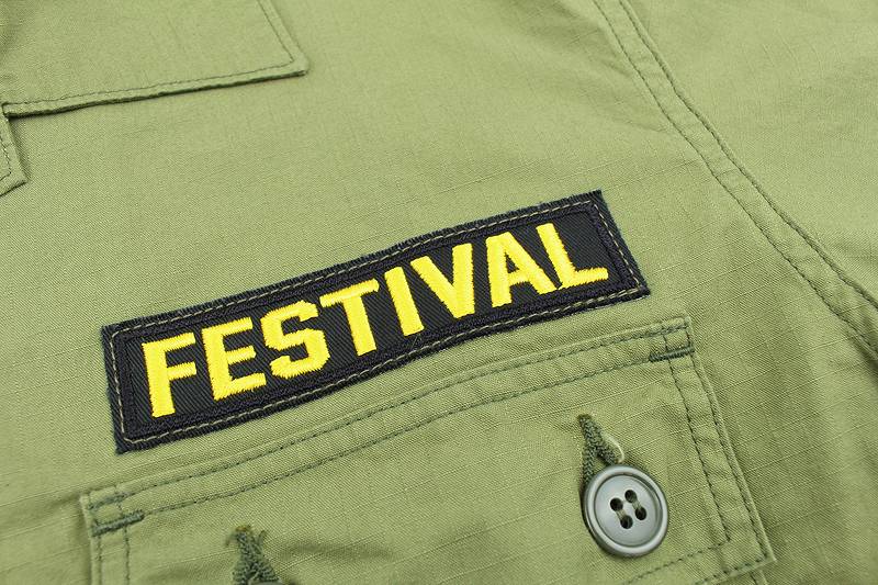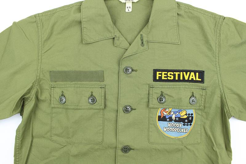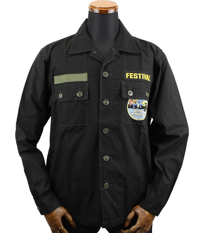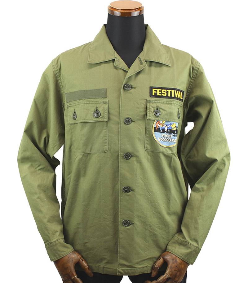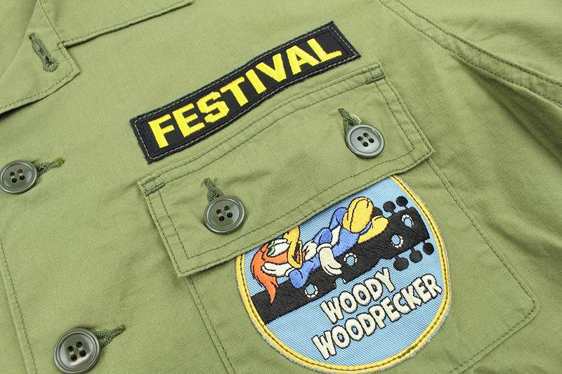 Custom shirt based on a civilian type U.S. military utility shirt. The main character chosen is Woody Woodpecker, a toon character created by Walter Lantz. The inspiration was the legendary Woodstock Festival concert held in Sullivan, NY in 1969.