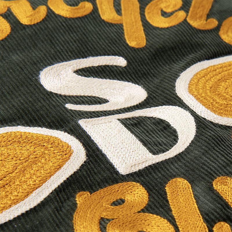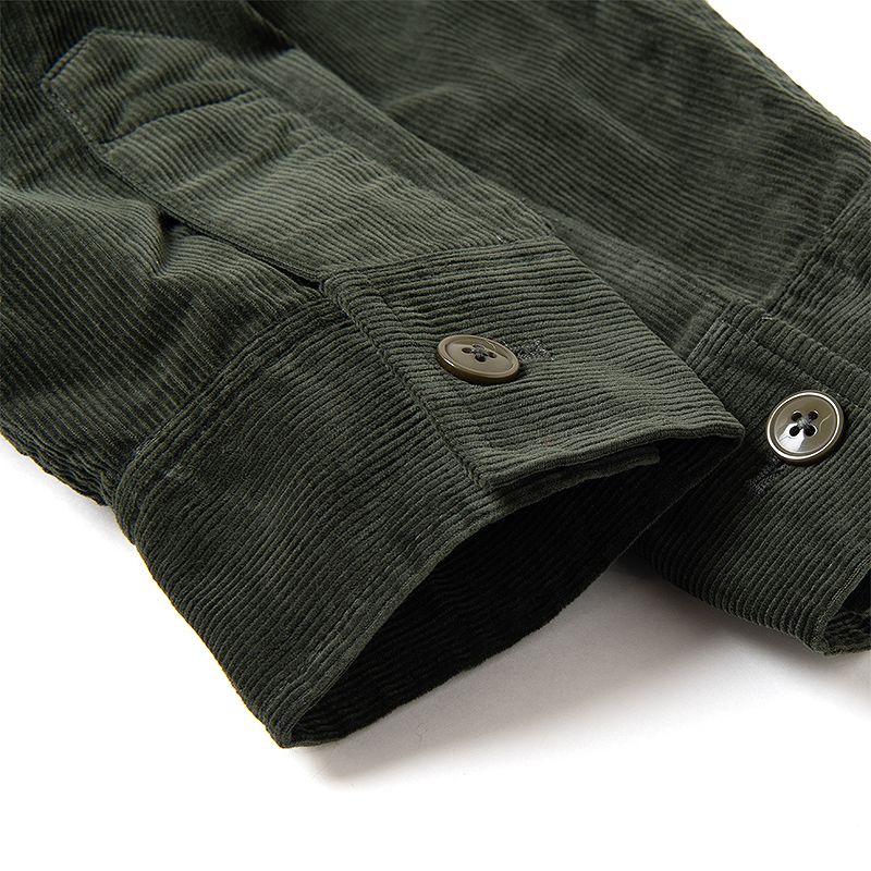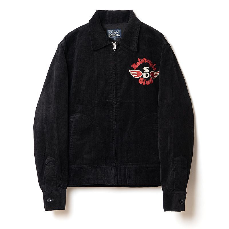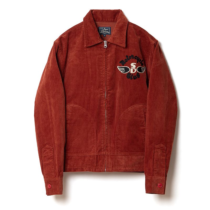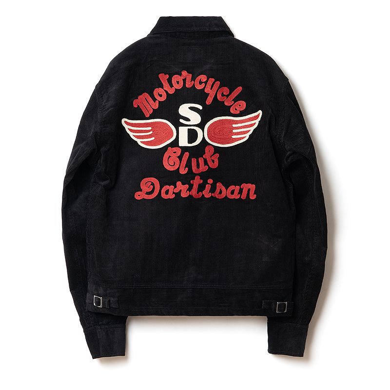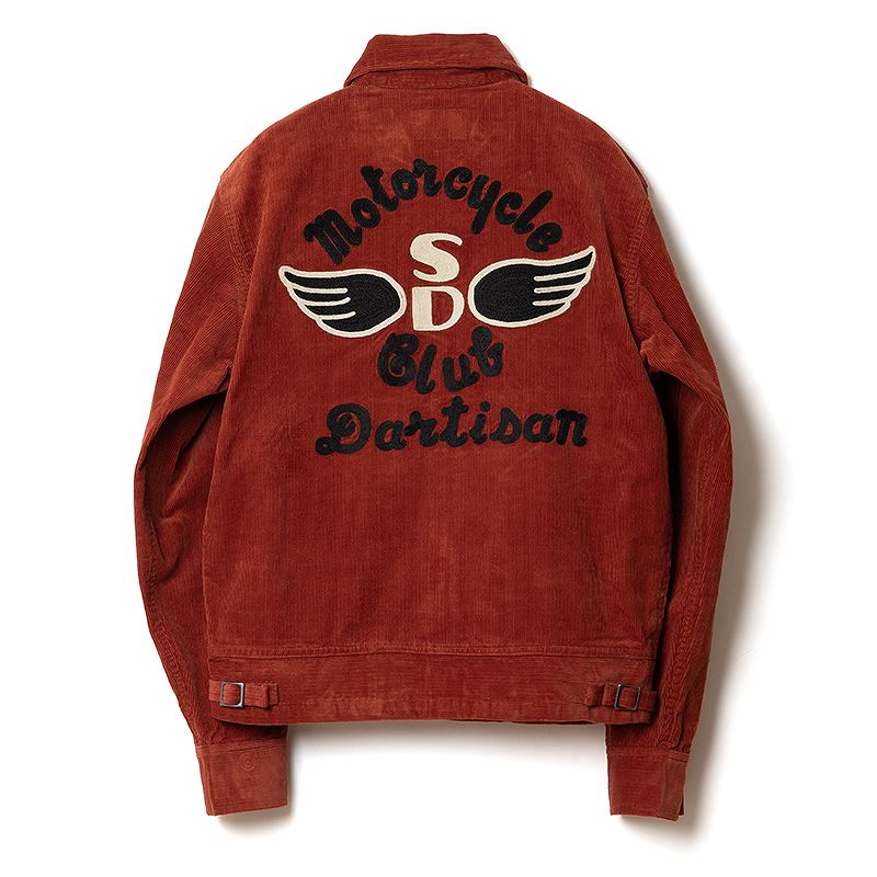 This is a corduroy jacket inspired by vintage motorcycle clubs.