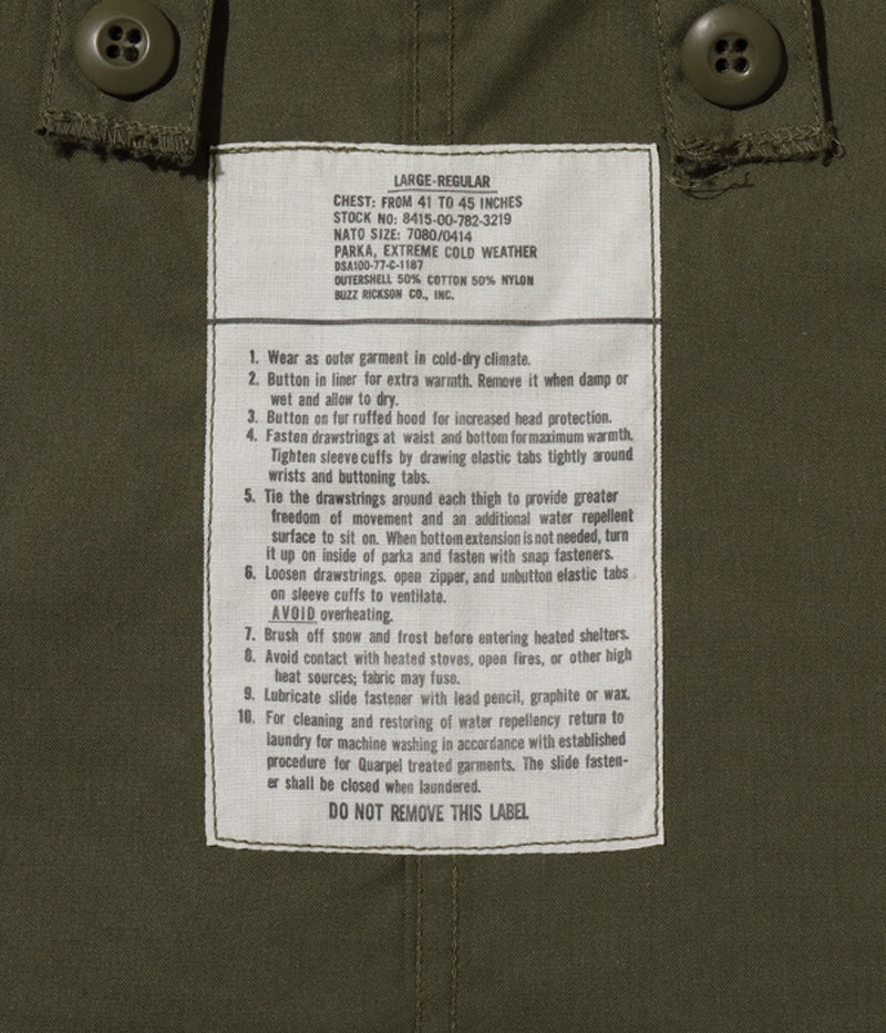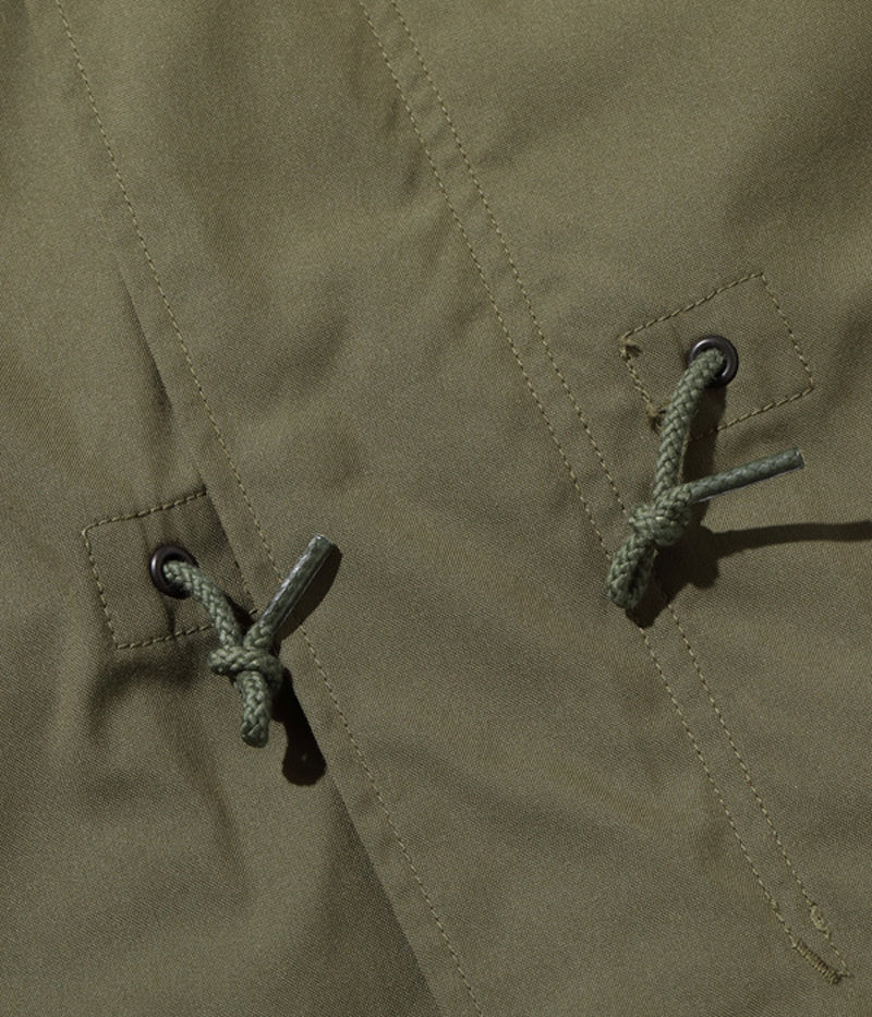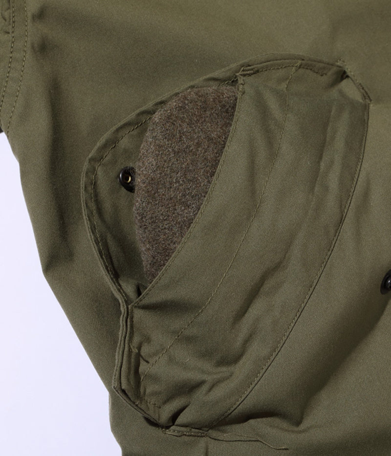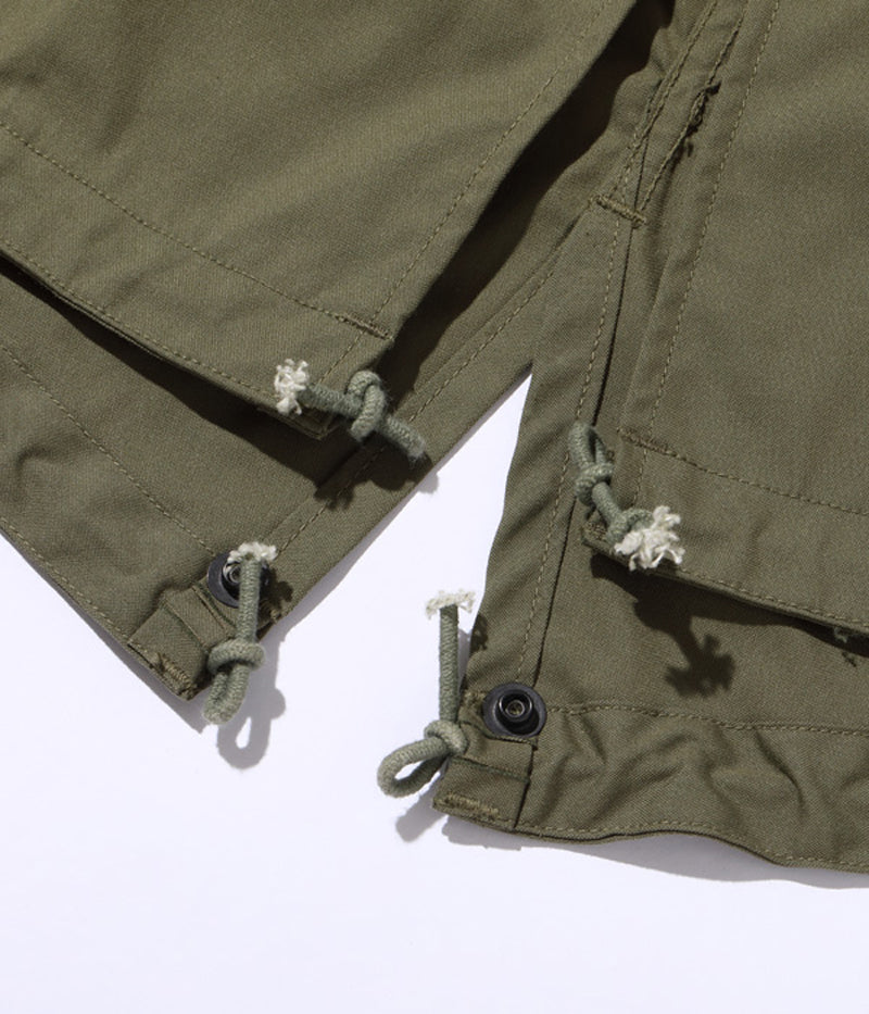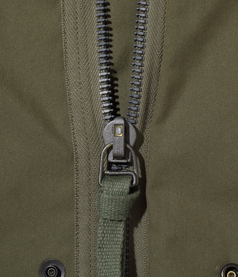 The M- 65 parka is the successor model of the M-51 parka. Although it is sometimes confused with the M-65 field jacket, they are entirely different. While the M-51 parka had thick satin outer material, the M-65 parka adopted the light and durable cottonnylon oxford weave. Its advantage was that it dried fast even if it became wet from activities in wetlands. Also, the M-51 parka had a hood that was attached to the body, while the M-65 parka has a detachable hood. Like the M-51 parka, the M-65 parka has also a big slit, known as “fishtail” on lower back. The slit enables the drawstring from the hems on the front and back to be tied beneath the thigh to trap warm air.