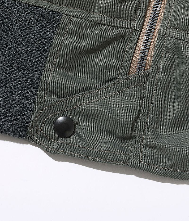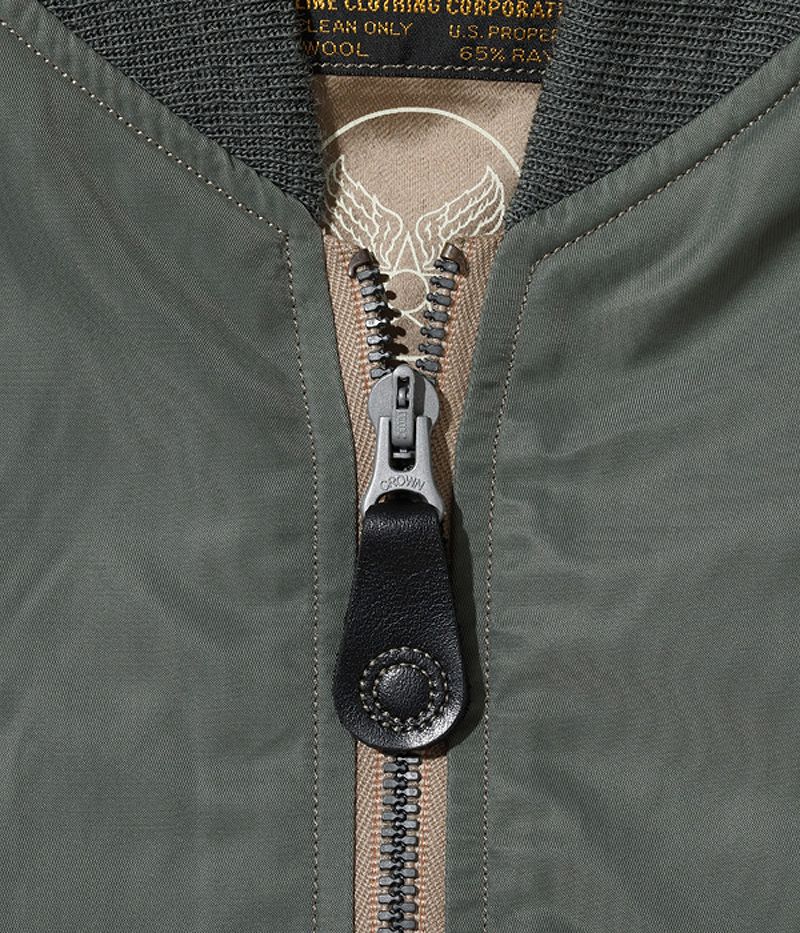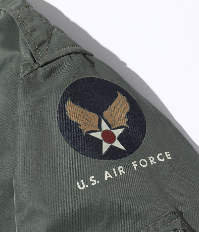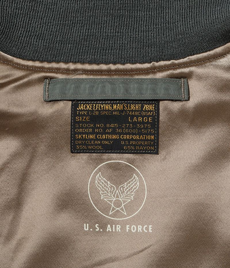 The Type L-2B jacket, which is designed for use in "LIGHT ZONE" (temperatures between 10°C and 30°C), is a relatively long-serving jacket that was used from 1955 until 1979, after repeated improvements. It has a smooth lining that is easy to put on and off even when sweating. It uses an expensive and time-consuming double-faced fabric in which the warp threads are made of rayon and the weft threads are woven with wool, and the wool is raised. Early L-2B model features epaulettes on shoulder, pocket flaps, and a triangular tab at the bottom of the zipper, distinguishing its appearance from the MA-1 adopted in the same era. This L-2B is a reproduction of the model that Skyline Clothing Corporation delivered in 1958. The company was a high-quality contractor boasting solid technology and large production capacity that also produced the MA-1, N-2B, and N-3B during the same period.