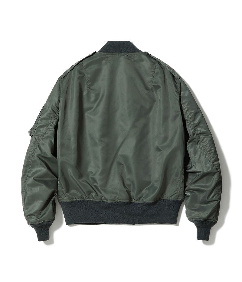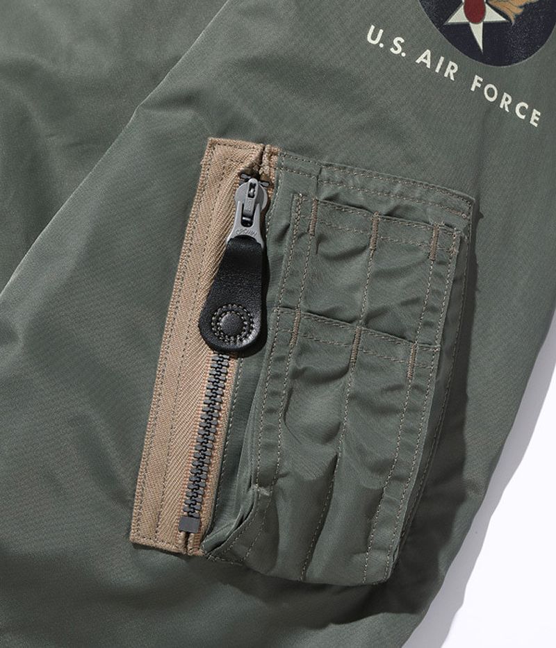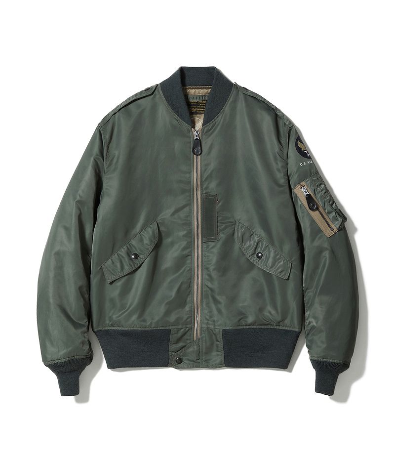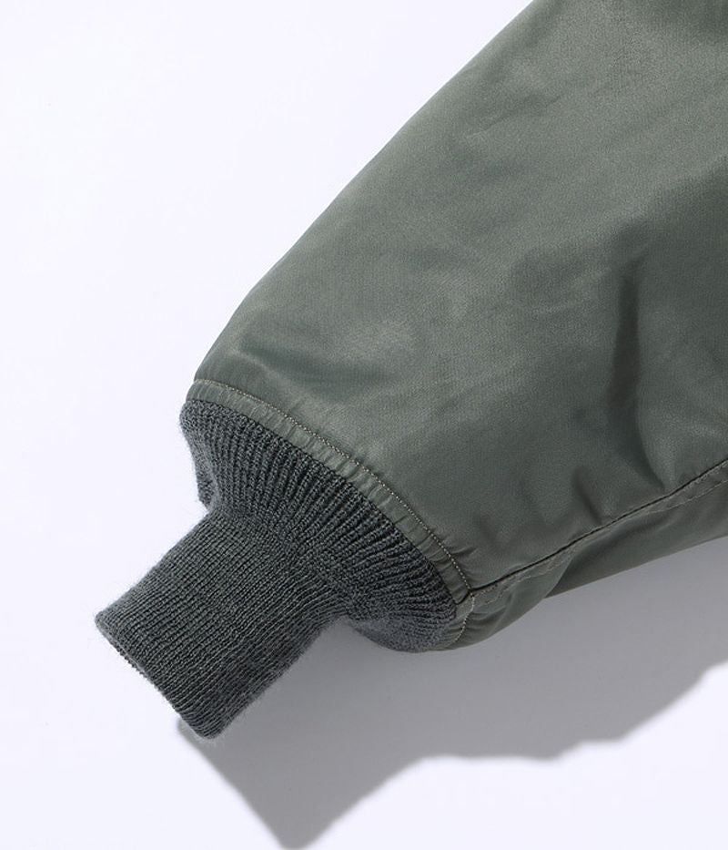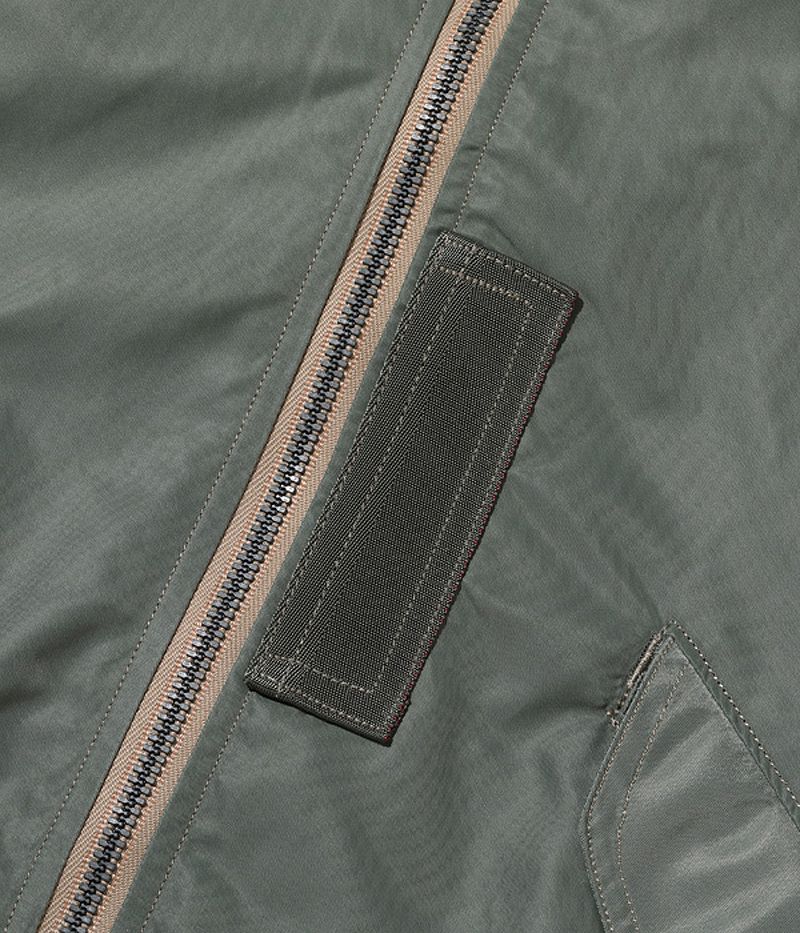 The Type L-2B jacket, which is designed for use in "LIGHT ZONE" (temperatures between 10°C and 30°C), is a relatively long-serving jacket that was used from 1955 until 1979, after repeated improvements. It has a smooth lining that is easy to put on and off even when sweating. It uses an expensive and time-consuming double-faced fabric in which the warp threads are made of rayon and the weft threads are woven with wool, and the wool is raised. Early L-2B model features epaulettes on shoulder, pocket flaps, and a triangular tab at the bottom of the zipper, distinguishing its appearance from the MA-1 adopted in the same era. This L-2B is a reproduction of the model that Skyline Clothing Corporation delivered in 1958. The company was a high-quality contractor boasting solid technology and large production capacity that also produced the MA-1, N-2B, and N-3B during the same period.