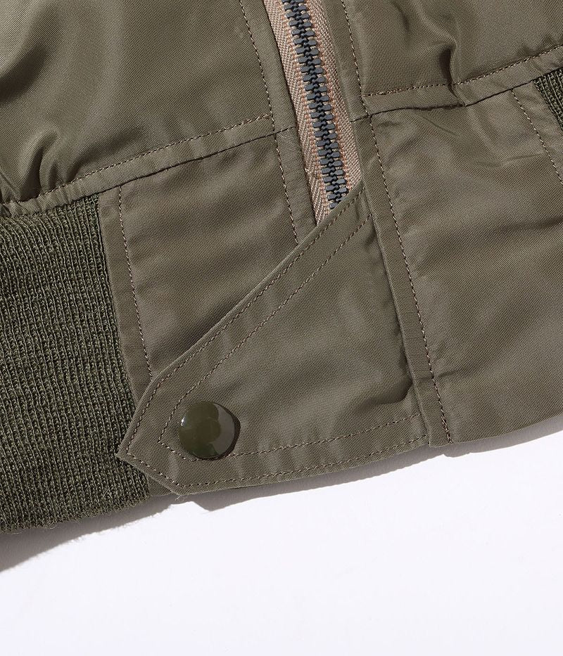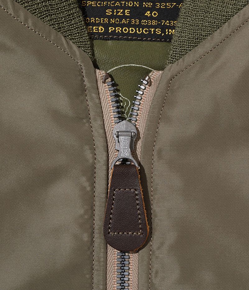The US Army Air Forces tested various materials to overcome the various shortcomings of the A-2 summer flight jacket (expensive, difficult to mass produce, etc.). The Type L-2, a flight jacket for the light zone (temperatures between 10°C and 30°C), was completed on May 21, 1945, using nylon developed by E.I. du Pont de Nemours and Company in 1939. This new material and collar-removed design became the basic model of the US flight jackets in many years to come. The Type L-2 has a leather box tab to secure the oxygen mask hose and the lining is a double-weave fabric of smooth nylon and moderately warm wool. Only three contracts in total were awarded for the delivery of the L-2. This L-2 was one of the first pieces that Reed Products, Inc. produced in the first phase.