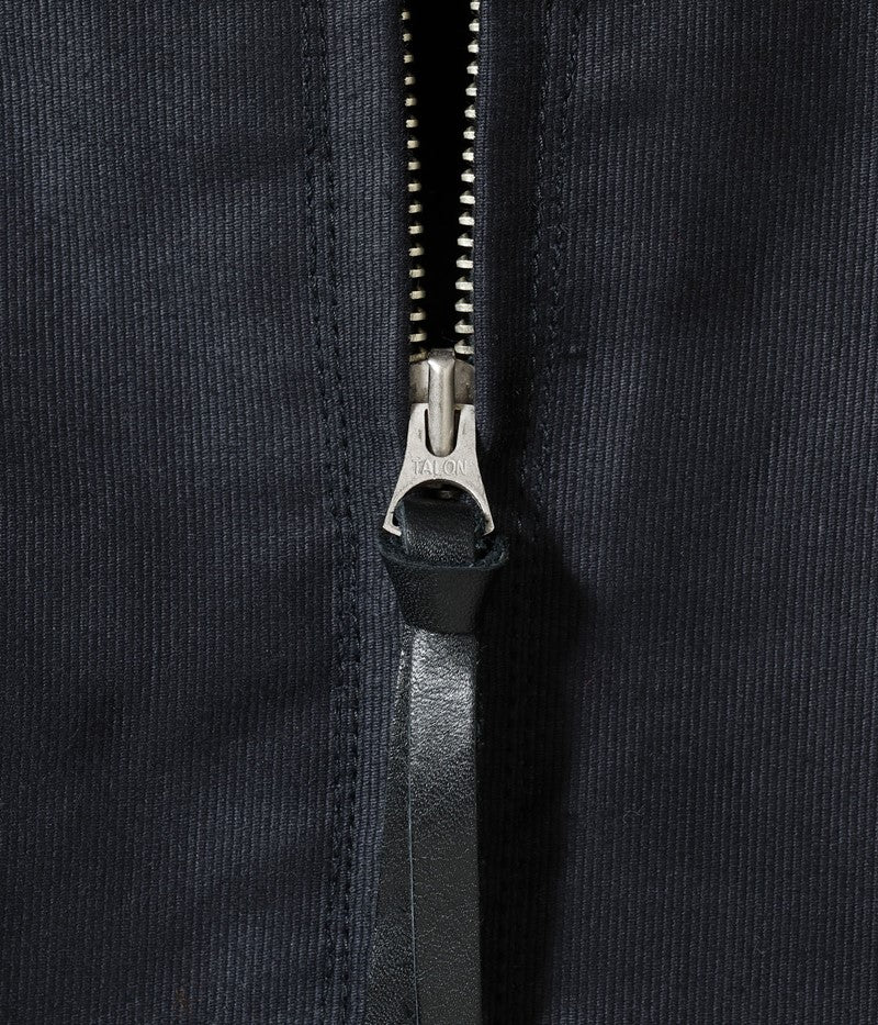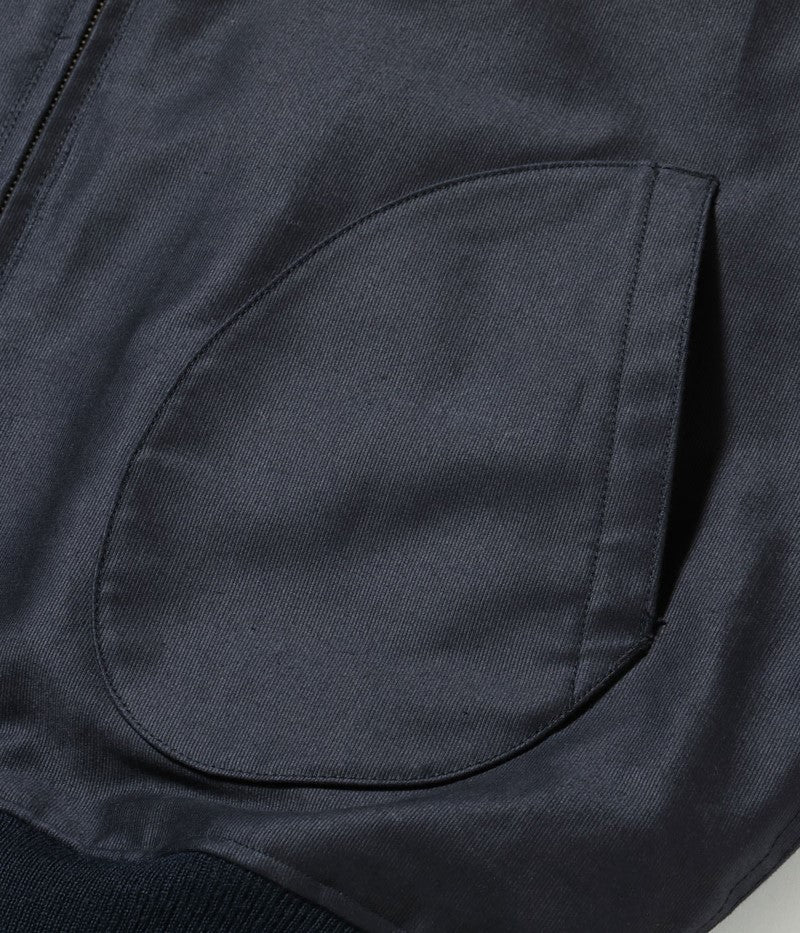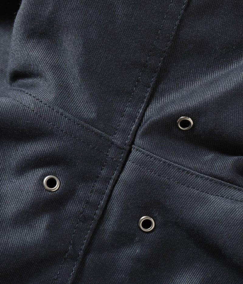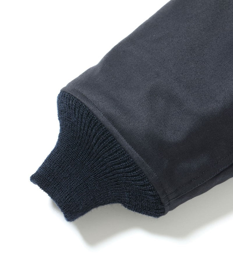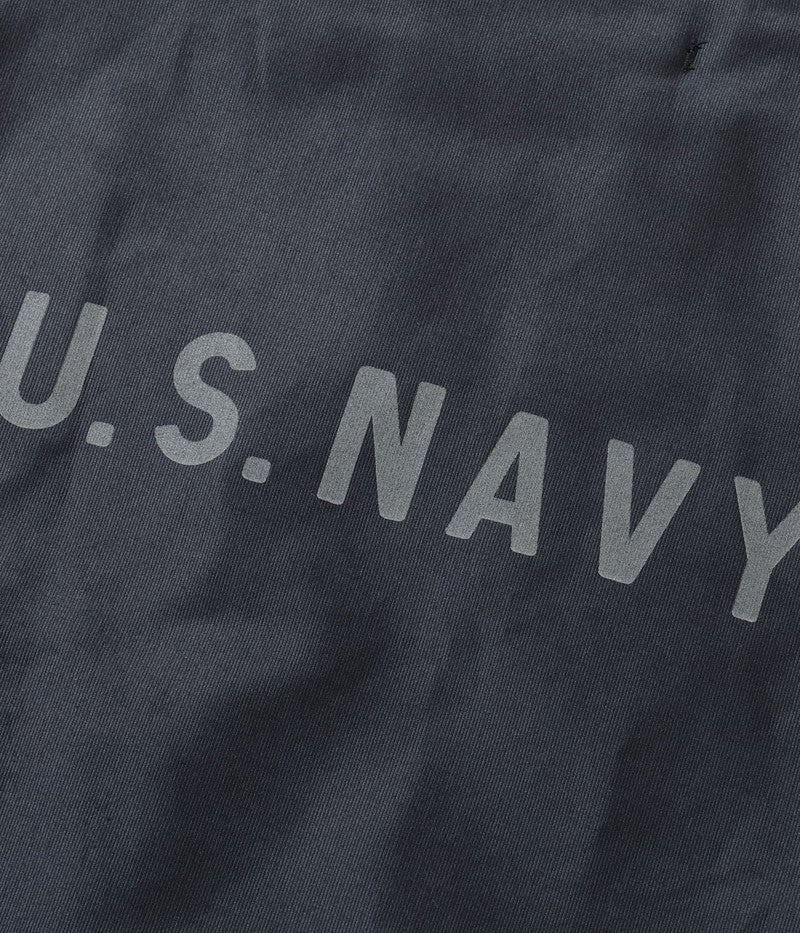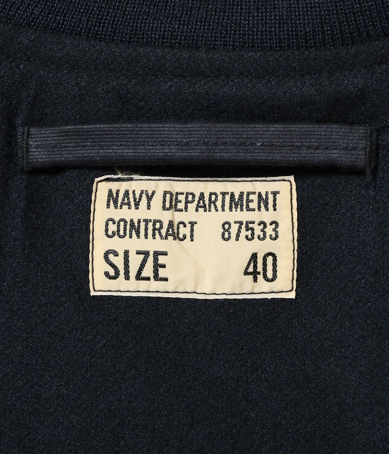 The deck jacket used from WWII to the Korean War was part of the US Navy's "Special Winter Clothing." Made of "jungle cloth," a windproof and water-repellent cotton grosgrain, the jacket's lining was a 26 oz. wool blanket, with organdy sewn inside for wind and water resistance. Early deck jackets had zip closures with an inner wind flap. Deck crew working in extreme cold at sea were equipped with a full set of gear including the jacket, matching trousers, headgear, wool face masks, leather gloves, goggles, and shoes.