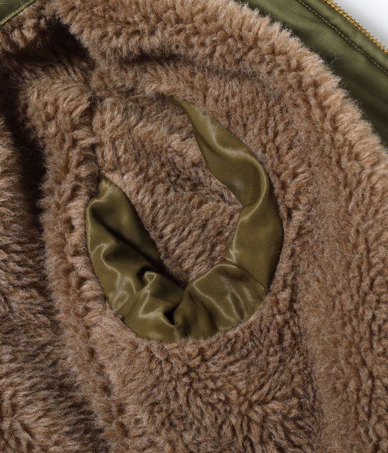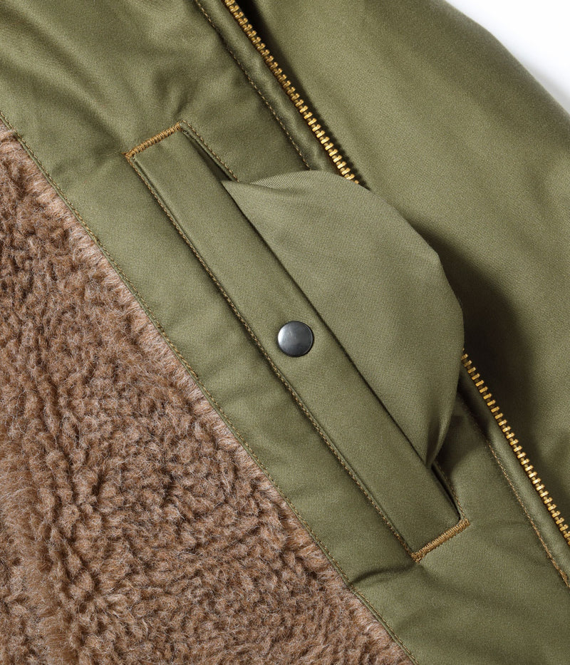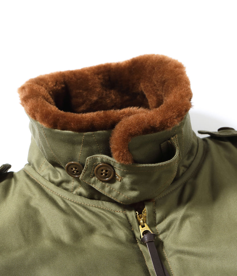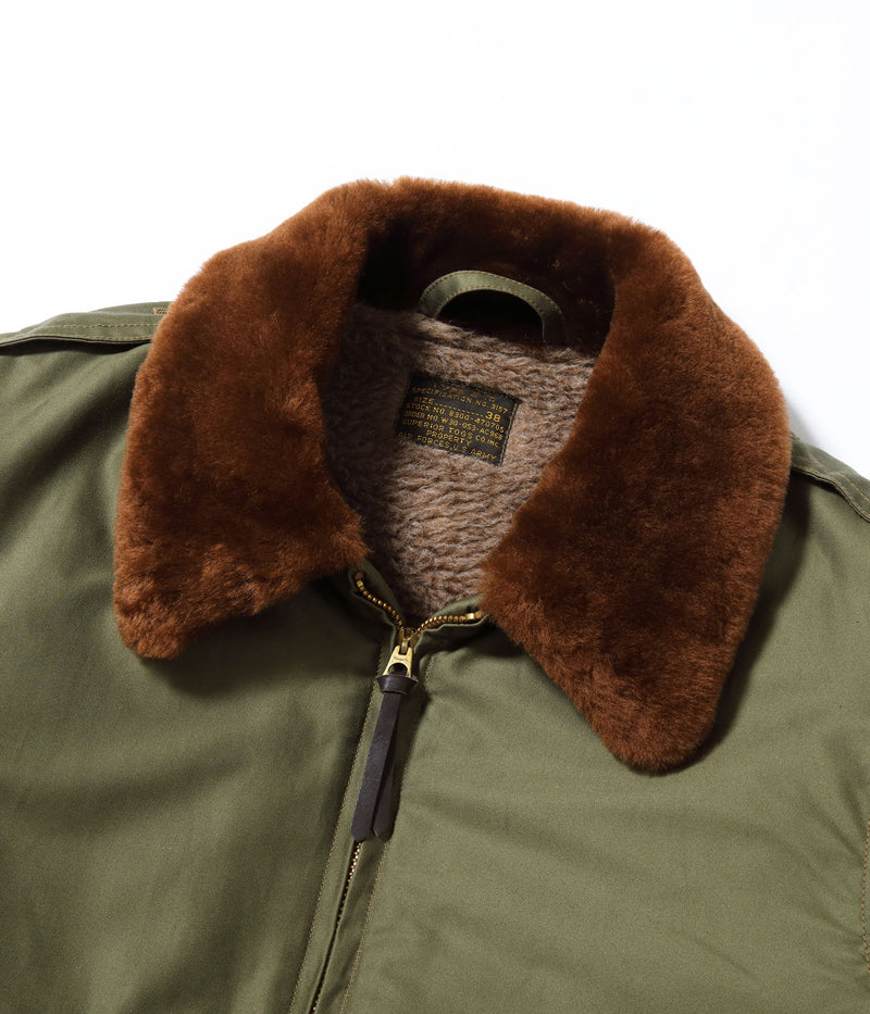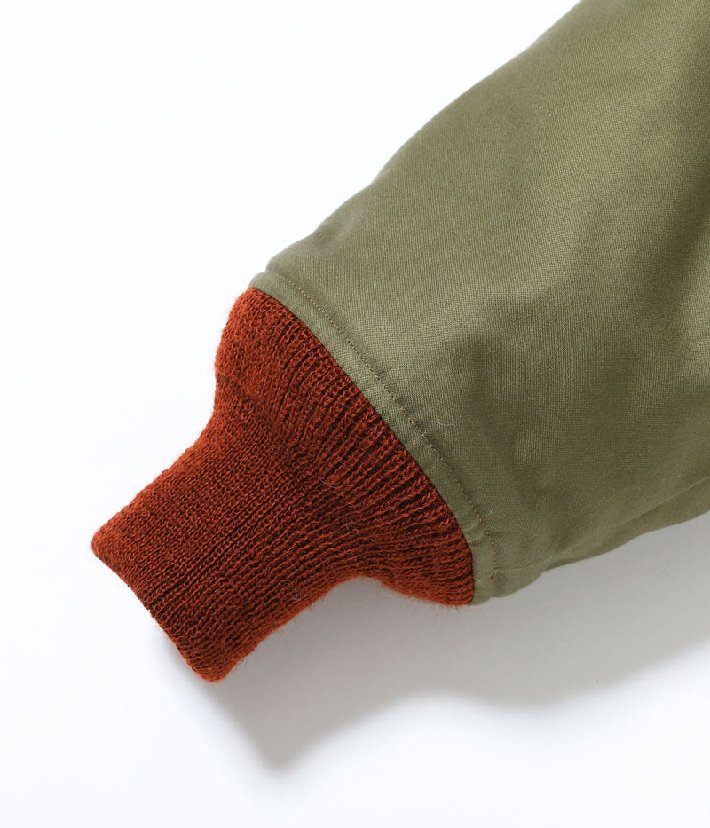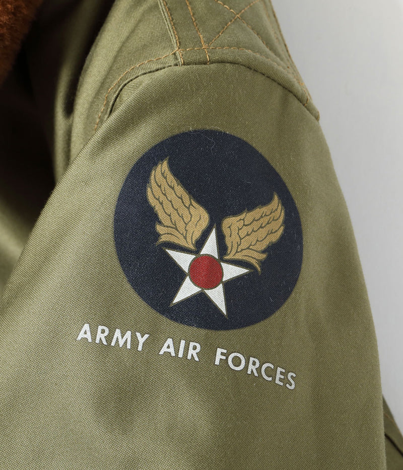 The Type B-10 was a fabric flight jacket adopted by the U.S. Army Air Forces in July 1943 as a replacement for the leather B-6 jacket, designed for mid-temperature ranges (+10°C to -10°C). During WWII, facing a severe shortage of leather, the Army reviewed production methods and developed a flight jacket made of cotton twill, suitable for mass production. The lining used alpaca mohair wool pile, which was less bulky and lighter than sheepskin yet highly insulating. Although the exterior resembled the “AN” series such as AN6552 or AN-J-3A used jointly by the Army and Navy, the Army Air Forces did not fully adopt the “AN” series for joint use. Instead, the B-10 was adopted as a new fabric jacket for mid-temperature use. This particular B-10 was produced by Superior Tog Company, contractor also for B-15, B-15A, and L-2A jackets, featuring an olive color with a striking contrast of red rib-knit cuffs, giving it a wild appearance.