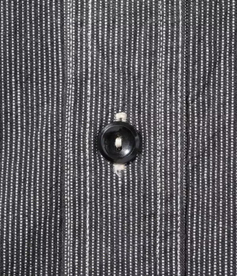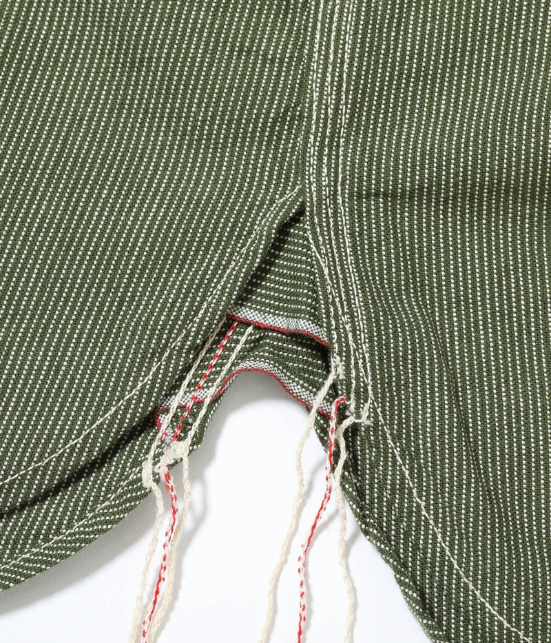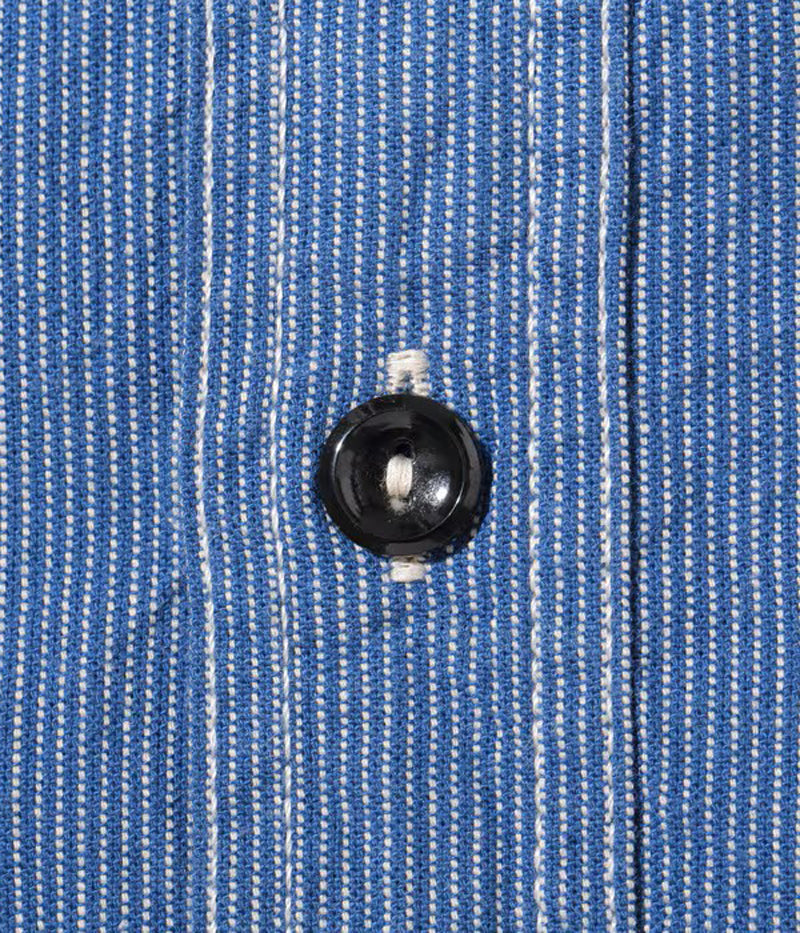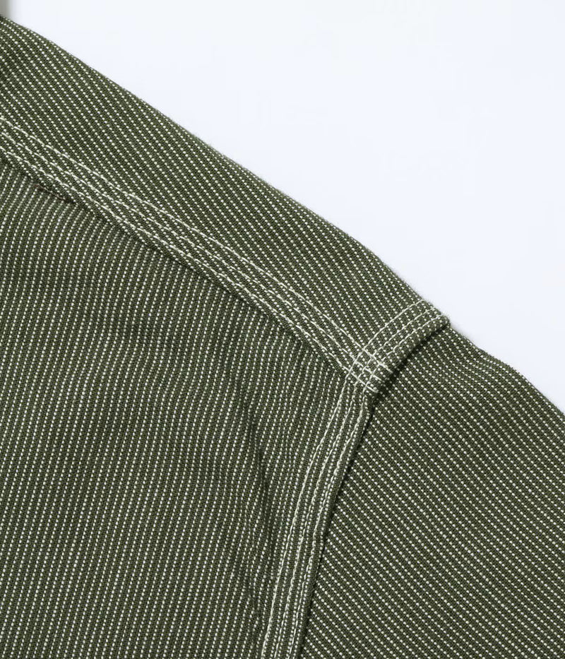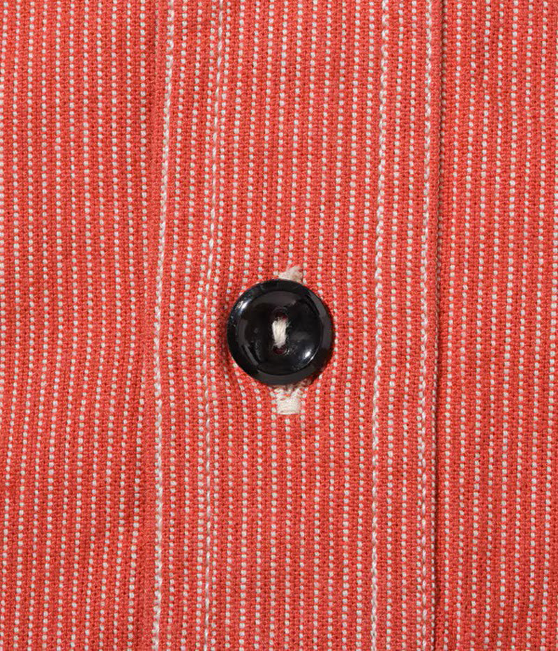 The work shirt made of jean cord (cord stripe) fabric woven with thick yarns. The texture of the fabric is slightly stiff and rough. It features the double-elbow construction, or two-layered fabrics at the elbows for extra durability.