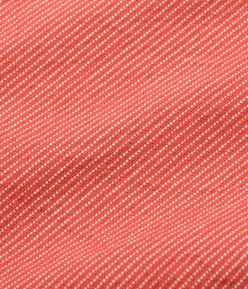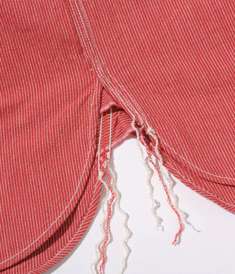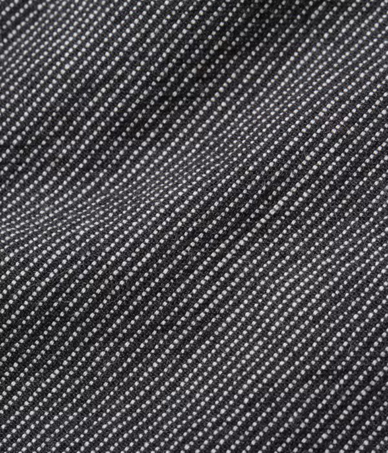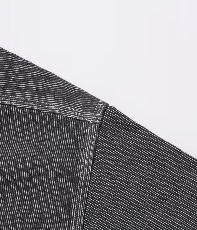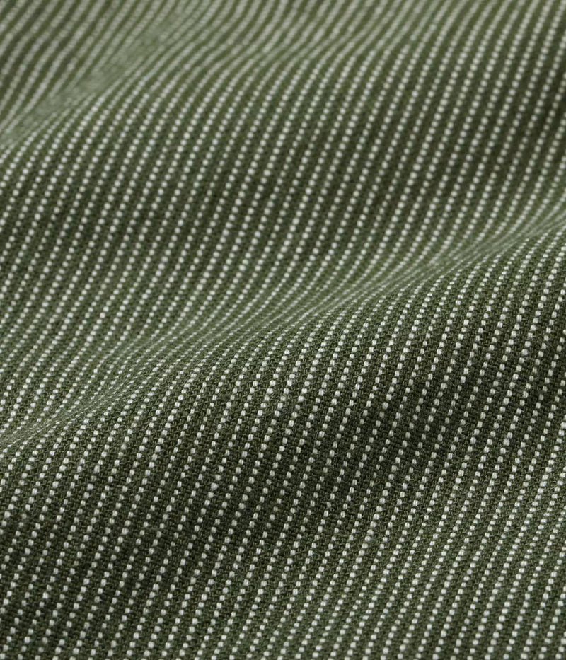 The work shirt made of jean cord (cord stripe) fabric woven with thick yarns. The texture of the fabric is slightly stiff and rough. It features the double-elbow construction, or two-layered fabrics at the elbows for extra durability.