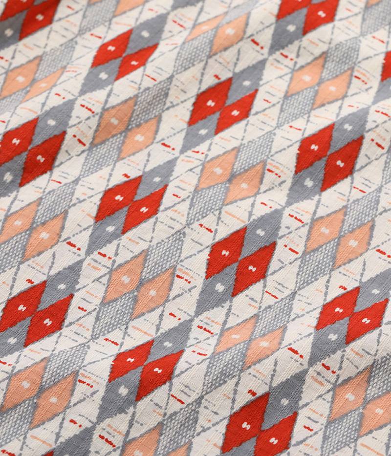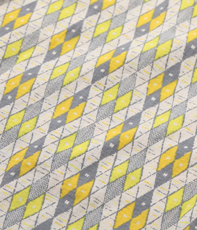 | Among the very popular and rare vintage "argyle" patterns, this pattern features a long row of diamonds across the entire surface of the shirt. The argyle pattern is printed in a gradation of similar colors on a matte-textured dobby cotton fabric. This work has a moderate size of diamonds and gives a pop impression without being too flashy, and is available in three color schemes of blue, yellow, and red with a 50s atmosphere. Late 1950s / Dobby Cotton / Over Print |