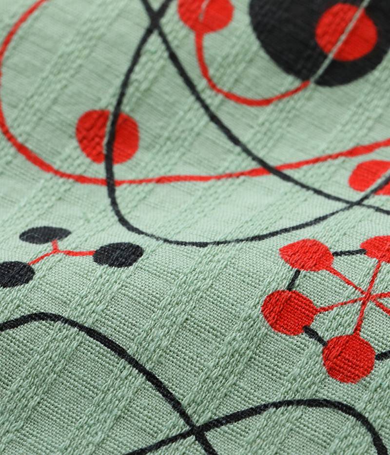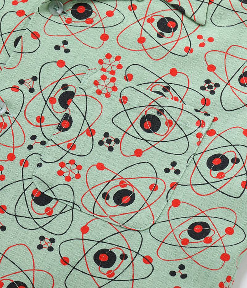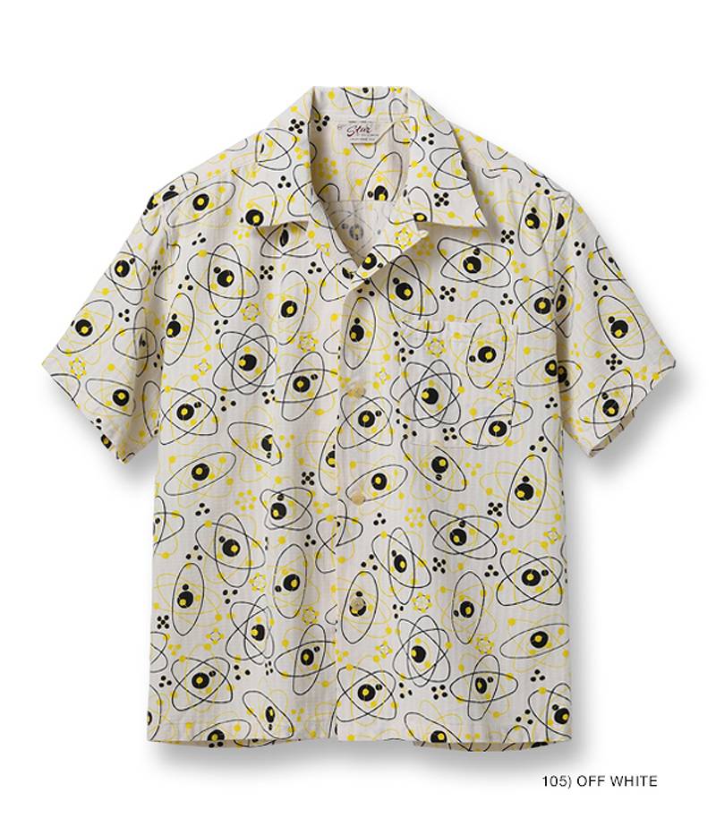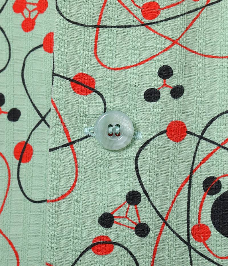 | Atomic patterns, consisting of circles and ellipses, were popular among artists in the 1950s, and were commonly known as "atomic" abstractions. In the vintage market, atomic patterns are found on fabrics such as curtains and lampshades, as well as on women's dresses. However, among them, men's shirts are very rare and highly valued for their artistic designs. Mid 1950s / Dobby Cotton / Over Print |