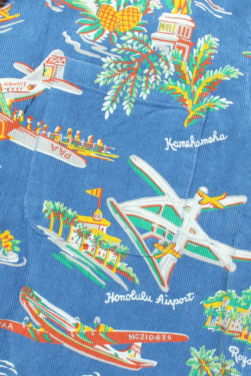 A collaborative piece between Pan American Airways and the Royal Hawaiian. This collectible features a Pan Am airplane with a visible registration number, the Royal Hawaiian Hotel, Waikiki Beach, and the King Kamehameha statue, all luxuriously incorporated into the vibrant design. Established in 1937, Royal Hawaiian Manufacturing is highly regarded among Aloha shirt collectors and is also known for creating many corporate-themed patterns.
