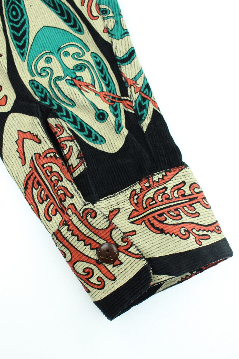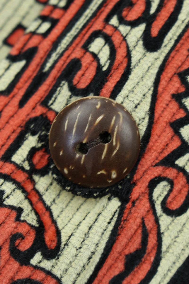 The fabric features the rich warmth and softness unique to fine corduroy, offering a distinctly different character from traditional rayon aloha shirts. With its moderate thickness and gentle hand, it wears comfortably as an inner layer beneath a jacket, yet retains a strong presence when worn on its own.