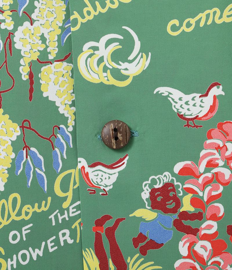 Paradise Sportswear, founded shortly after the war, created not only men's shirts but also dresses. Their works feature strong narrative messages, such as "Moewhane Dream Castle" (a castle of illusion in a dream) and "Paradise Isle" (a small island where dreams come true). In addition, these pieces are highly crafted, incorporating Hawaiian motifs like leis and hula dancers. This rare composition blends scenes of traditional Hawaiian life with storylines, all illustrated in a charming style.