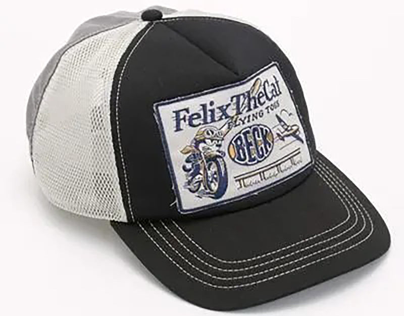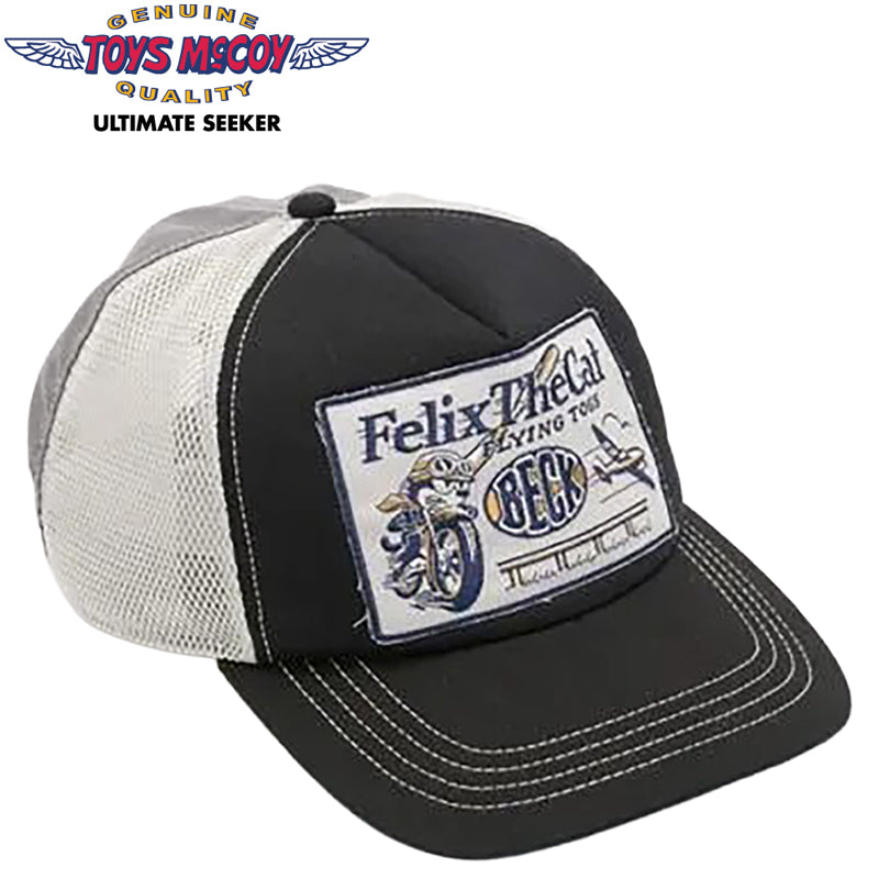The logo of the comprehensive accessory company BECK, inspired by aircraft and motorcycles racing boldly through strong winds. This well-known logo in the vintage scene has been reinterpreted by replacing its motorcyclist with Felix the Cat. An embroidered patch of this design is prominently placed on the crown of Toys McCOY original mesh cap.