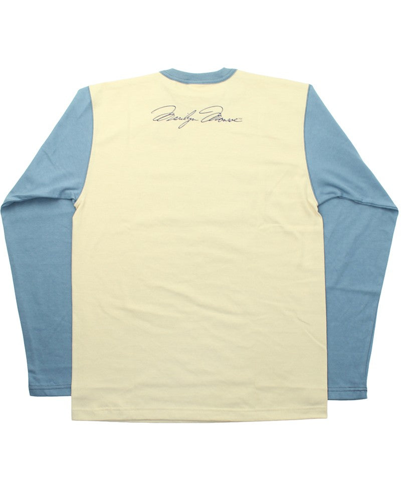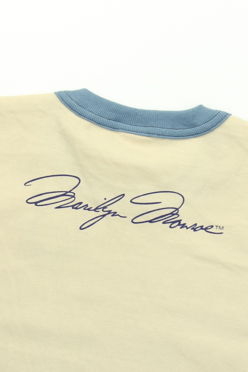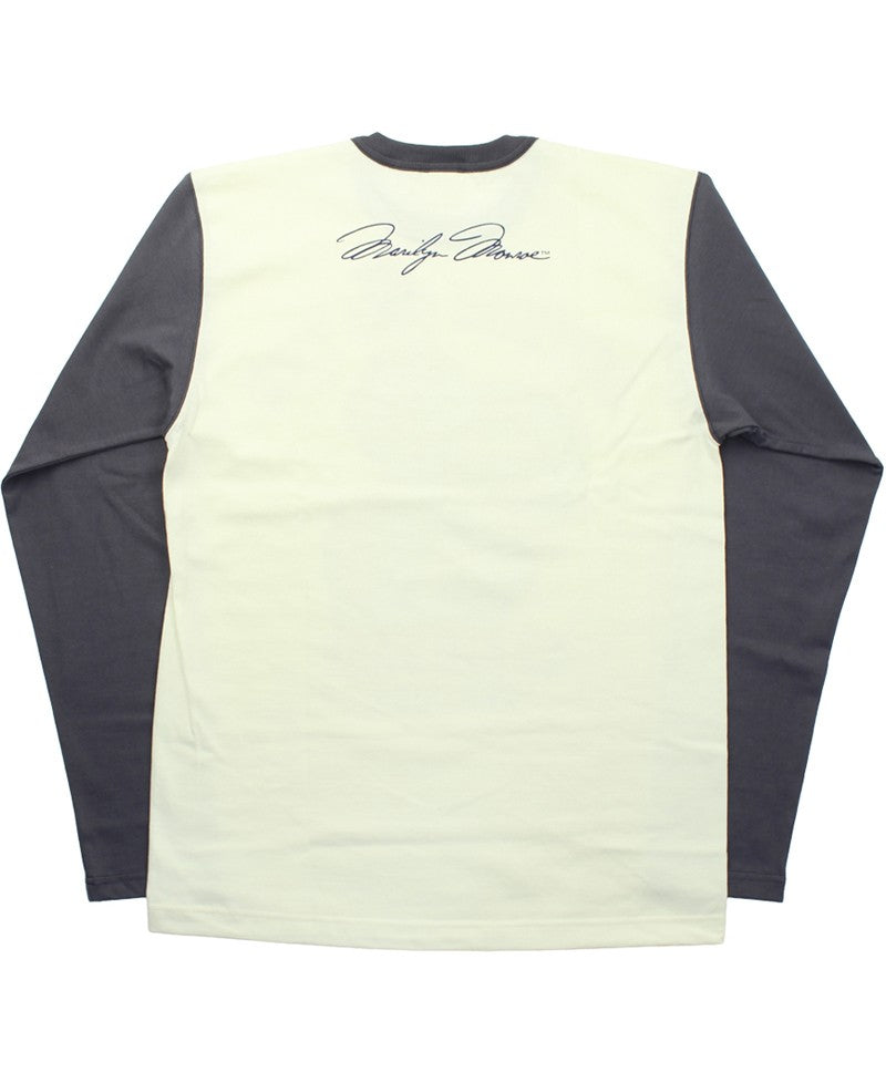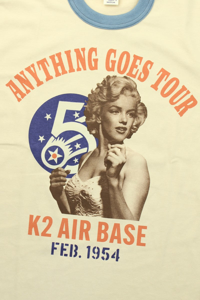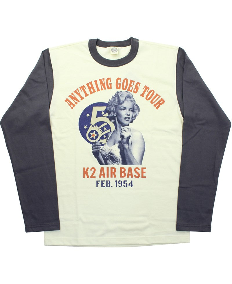 A long-sleeve T-shirt in a two-tone colorway pays homage to Marilyn Monroe. The name “ANYTHING GOES” references the band she was associated with. During her honeymoon trip to Japan with Joe DiMaggio, she unexpectedly brought members of the band along to visit U.S. military bases on the Korean Peninsula.
