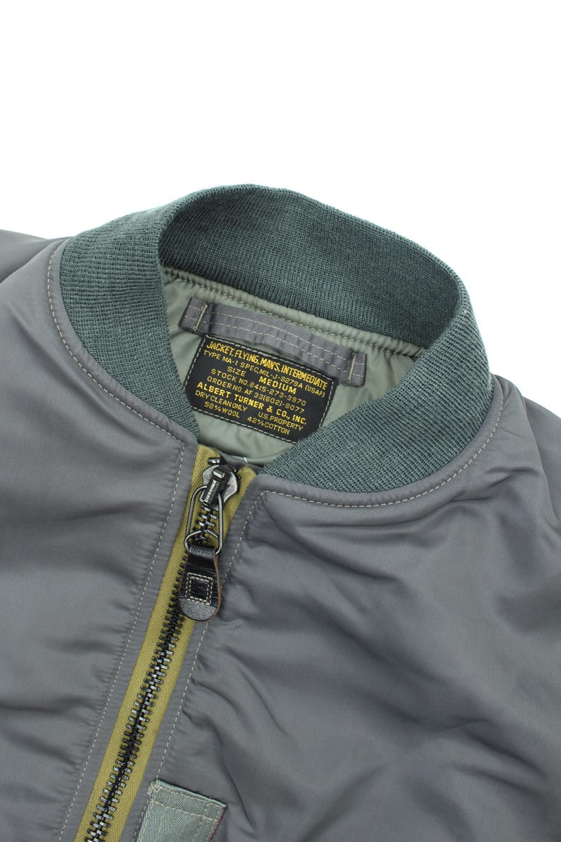 A faithful reproduction of the “MIL-J-8279A,” bearing the authentic name label of **Albert Turner & Co.**, one of the most renowned and capable contractors that supplied numerous nylon flight suits to the U.S. military. This piece recreates the **first revised model of the MA-1, the Type A**, specifically the rare version distinguished by its **square-shaped inner front flap**. The outer shell fabric has been meticulously reproduced to capture the unique **texture and grayish tone** characteristic of the early MA-1s, conveying the atmosphere and authenticity of the original down to the finest detail.