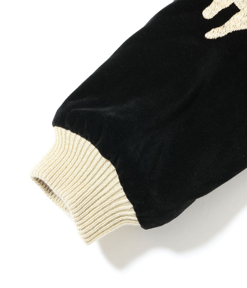 The so-called “Alaskajan,” inspired by the northern wilderness of Alaska. While the design featuring lightning bolts and polar bears is the most well-known, this version reproduces an actual vintage piece depicting drifting ice and a polar bear — an exceptionally rare variant even among Alaskajans. Alongside the bear is the aurora, a natural wonder visible only in the freezing northern skies. The sleeves are adorned with finely embroidered dog sleds, another beloved Alaskan motif.