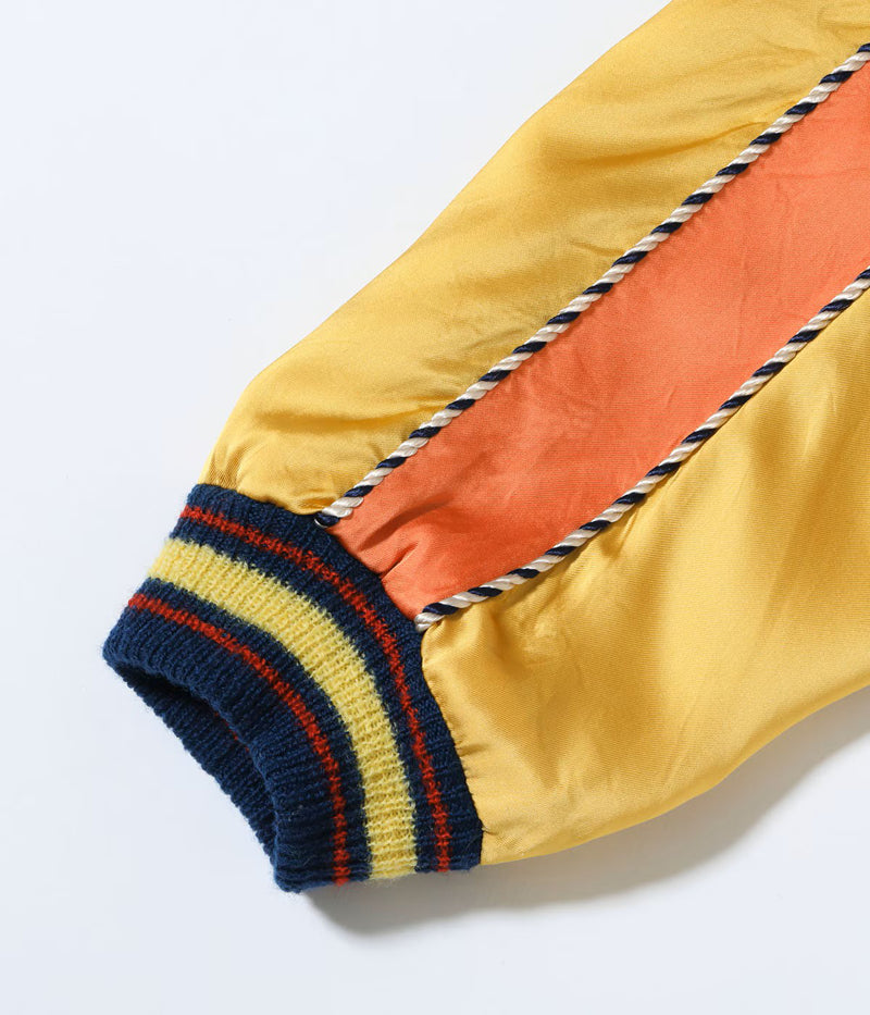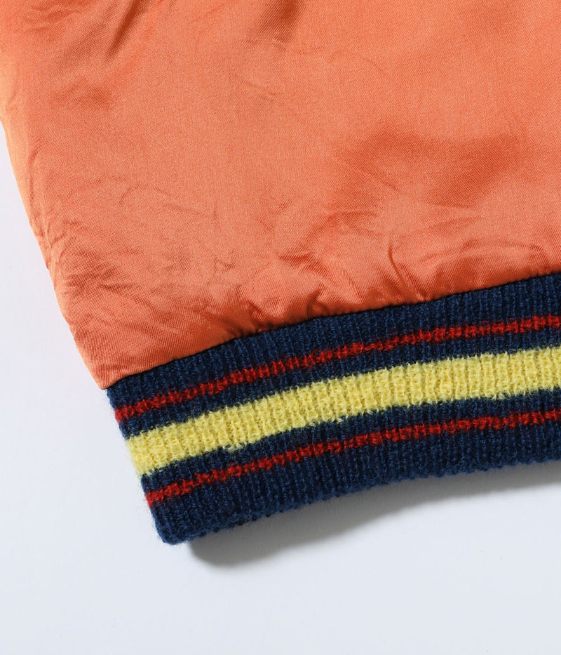 This jacket is an exact reproduction of a vintage model. On the face side, it features a powerful composition of an eagle and a dragon confronting one another against the backdrop of Mt. Fuji. Because the word “Japan,” which is often placed across the upper back, is absent on this version, each motif is rendered on a larger scale than usual. The embroidery captures remarkable depth and dimension, from the sculptural spread of the eagle’s wings—achieved through meticulously varied stitch directions—to the striking sense of perspective in the dragon’s advancing body. Black thread is also used selectively for details such as the eagle’s beak and talons, as well as the dragon’s mouth, further intensifying the dramatic presence of the design. Set against the exceptionally rare orange-and-yellow body, the embroidery stands out with extraordinary vividness.
