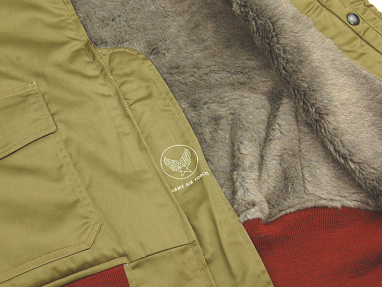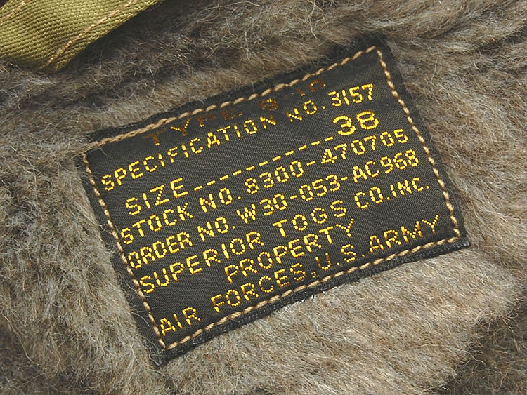 | フライトジャケットを作る上で欠かせないのが、軍が作成する仕様書、ミリタリー・スペシフィケーション=ミル・スペック。これはフライトジャケットに限らず、戦闘機から食品まで軍が使う全品目に渡り作成されている。それは誰が作っても同一の完成品が出来上がることを的としていた。フライトジャケットに於いてはデザイン・素材や縫い目の間隔に至るまで細密に規定されている。しかし、中にはイレギュラーなバリエーションも存在する。通常B-10のリブは、アウターシェル同様のオリーブ色が一般的であるが、このスーペリア・トッグス社製のB-10 には赤いリブニットが装着されている。 | |||||||||||||||||||||||||||||||||||||||||||||||||