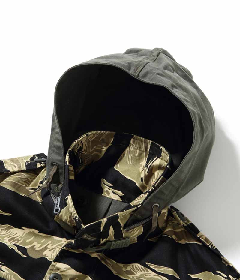 | 究極のフィールドジャケットとして君臨し続けるM-65。そのルーツは第二次大戦時のM-41フィールドジャケットに始まり 時代と共に試行錯誤の上改良が重ねられ ベトナム戦争でその完成形をみることになる。この完成度の高いM-65は現在の民間衣料にも多大な影響を与え続けているが 当時としても画期的なジャケットで兵士達からは絶大な人気を得ていた。当時 現地のベトナムでは米軍将兵からすれば実に安い代金でオーダーメイドの衣服を仕立てることができた。そこで兵士達は官給品のジャケットを基地周辺のテーラーに持ち込み 調達可能な素材を使って「これと同じ型のジャケットを作ってくれ」と頼んだのである。こうして官給品とはひと味違ったタイガーパターンなどのジャケットが誕生したのであった。 | ||||||||||||||||||||||||||||||||||||||||||