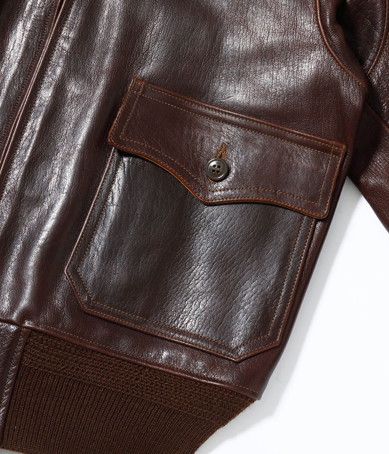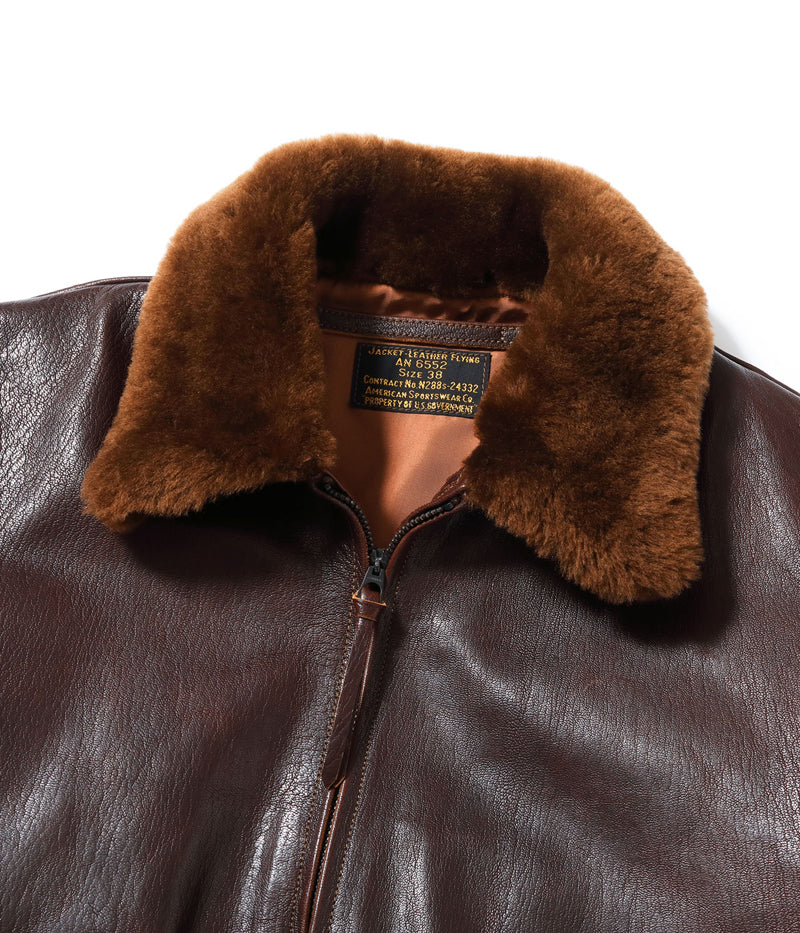 海軍と米海兵隊が使用したM-422Aの後継モデルとして登場したのがAN6552である。M-422A同様にゴートスキンを用いており、外観はM-422Aとほぼ同一だが米陸軍航空隊との共通使用目的からモデル名が変更された。そのモデル名はARMYとNAVY両軍の頭文字を採用しており、そのことから通常G-1系統のジャケットの襟裏には『USN』とマーキングされているが、このジャケットは両軍共通使用目的として『US』と記されている。主な変更点はM-422Aではニッケル仕上げのジッパーを使用していたが、真鍮製に黒い酸化処理を施したジッパーに変更されている。AN6552(AN-J-3A)は1944年から1947年まで採用され、朱色の美しいライニングを持つAMERICAN SPORTWEAR社のAN6552は1944年に納入された。一般的に求められる革素材は『個体差の無い均一なもの』だが、この革はその対極にある『一枚一枚個体差のある不均一なもの』をコンセプトに革作りから始動。厳選した厚手のゴートスキンを用いて植物タンニン液で鞣し、その後、薄めの色から下地を染色し、その上から染料で調色することで自然な色むらが表れている。さらには最終仕上げに職人の手によって固形のワックスを熱で溶かしながら丹念に擦り込まれている。こうした工程を経たゴートスキンは太陽光の下で下地の色が透けて見え、 深みのある色合いに仕上がっている。頭から尻にかけて縦に流れる美しいシボを持つゴートの本性に覚醒するのである。