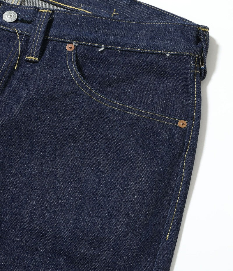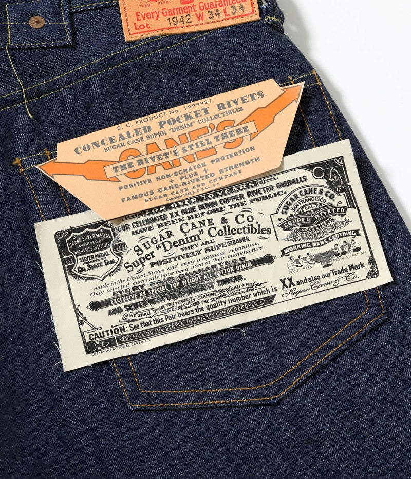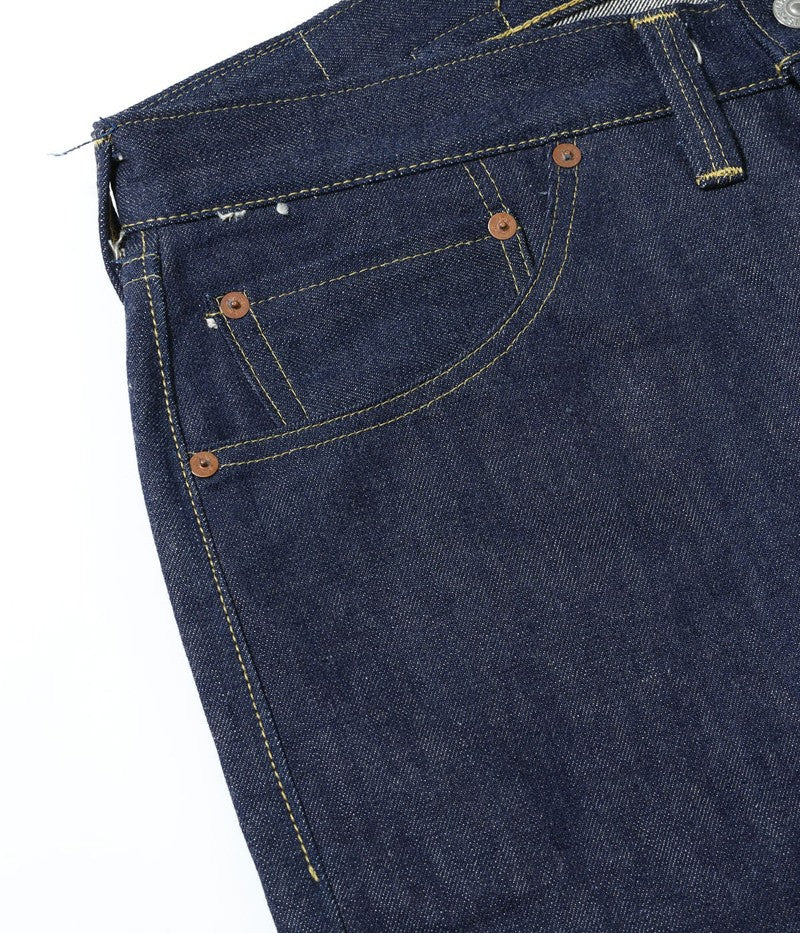一見すると1937年モデルに見えるが、フラッシャーの最下部に「Copyright 1942」の表記が入る非常に珍しい1942年の前期モデル。1942年の4月から8月までのわずかな期間にだけ生産されたもので、バックストラップや股リベットがまだ省略されていない。1937年モデルはコンシールリベット部分に通常の銅リベットの頭を潰して使用していたのに対し、本作は鉄製の専用リベットを採用している。その変更に伴い、フラッシャーの「CONCEALED COPPER RIVETS」が「CONCEALED POCKET RIVETS」表記に変更された。1937年モデルとは明らかに異なる厚みとムラを持つデニム生地や、このモデルにしか見られない黒いメッキを施した鉄製バックルを専用に製作。ボタン裏のタックは銅メッキのタイプを使用している。