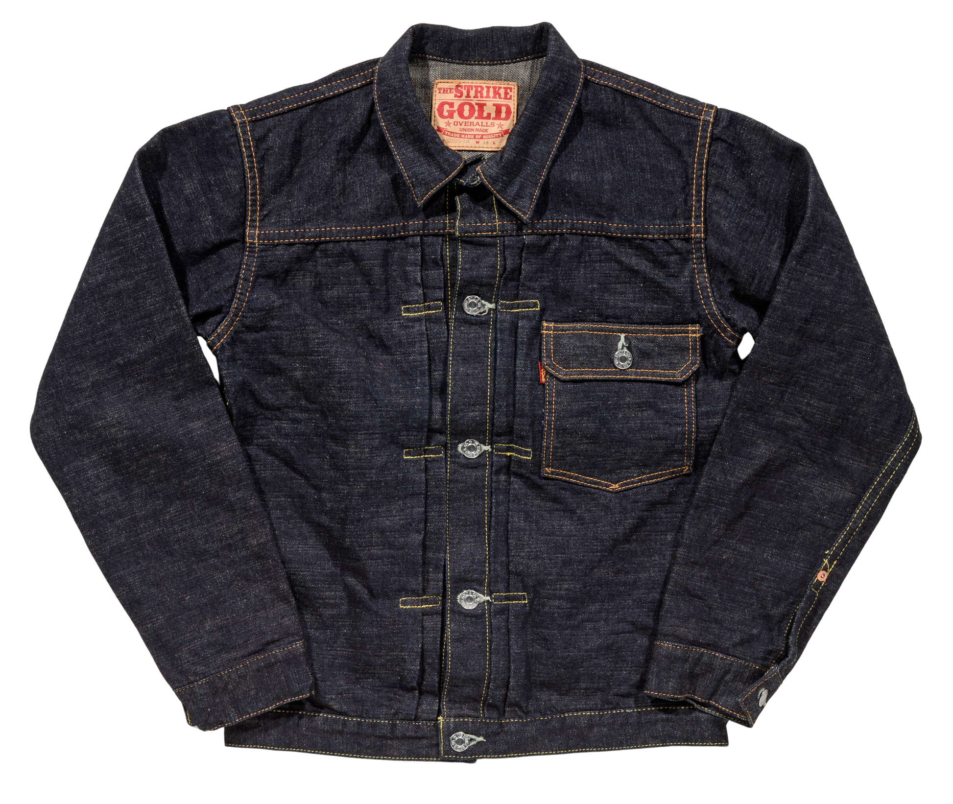 いわゆる1stモデル後期型の1枚袖デニムジャケットが、デザインモチーフとなっている。 ストライクゴールド クラシックシリーズで定評のあるオリジナル右綾15オンス横スラブセルビッチデニムを用いて、クラシックな色落ちと肌に馴染んでいく独特の着心地を追求。