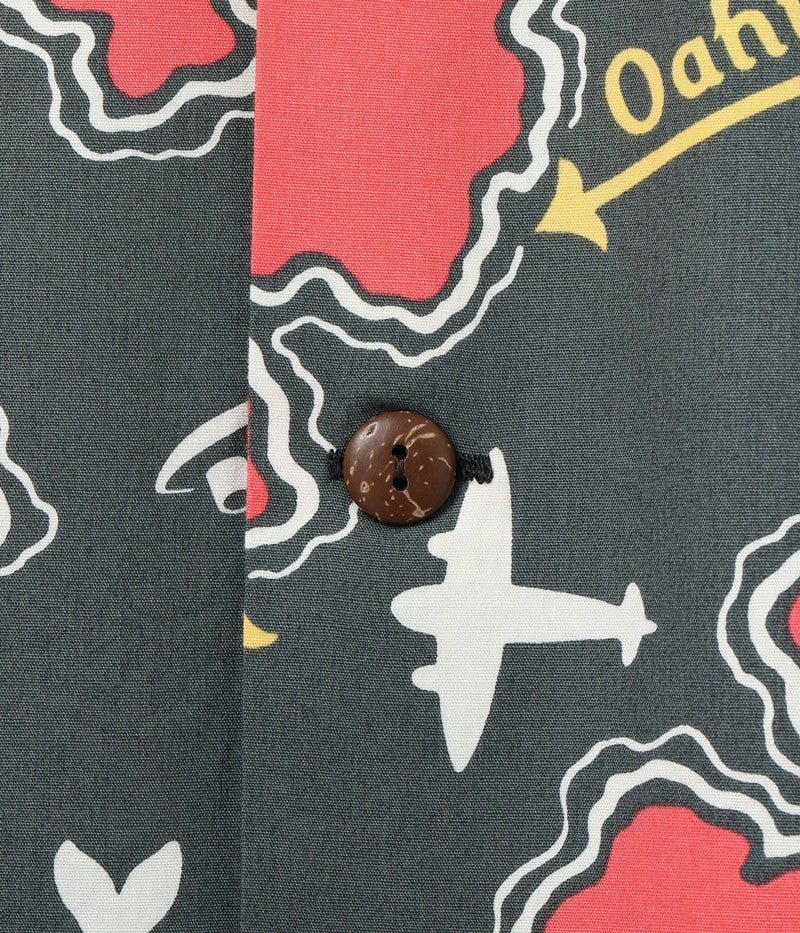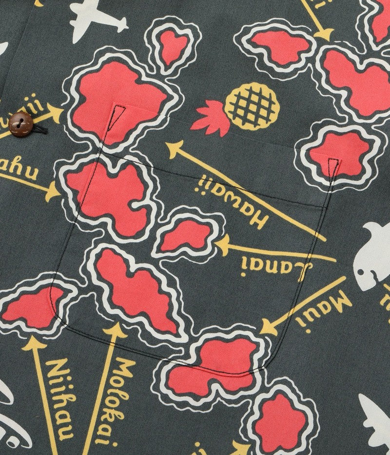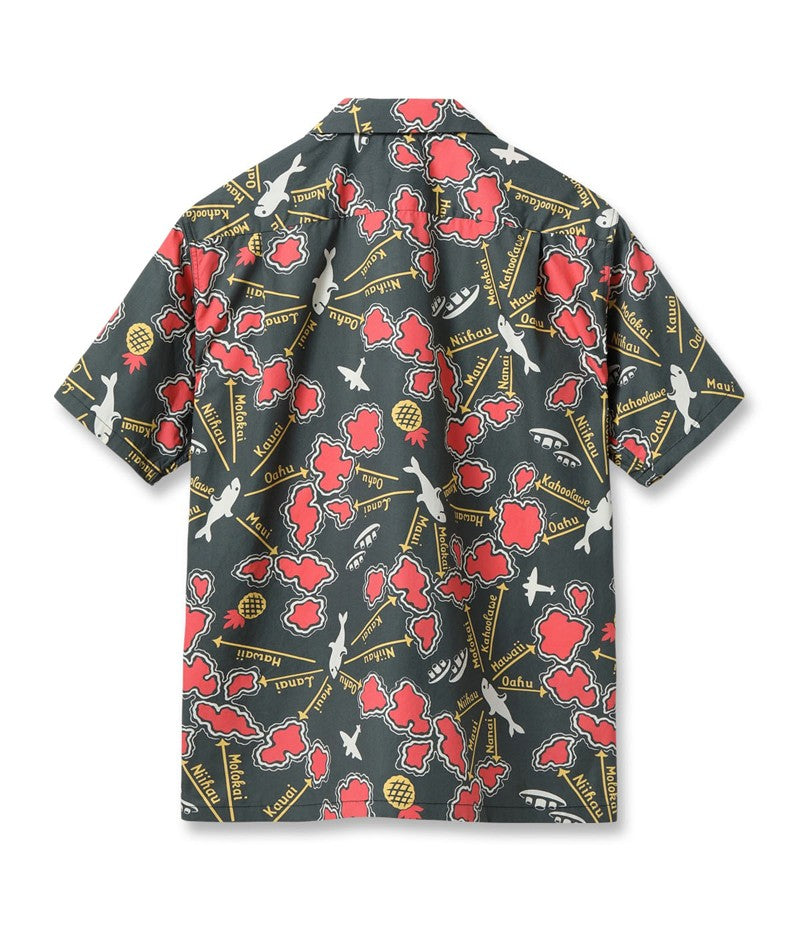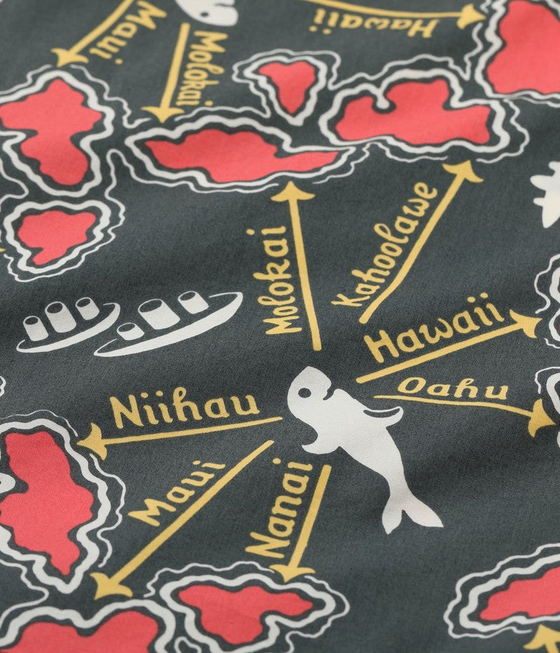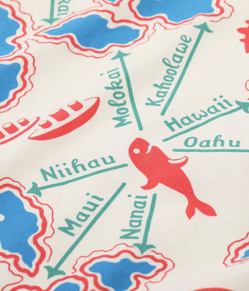 1936年にハーブ・ブライナーが15人の工場からスタートし、1945年にはハワイ島ヒロに従業員200人の大規模な工場を作り、名実共にアロハシャツメーカーのトップに立ったカメハメハ・ガーメント社。このシャツは同社が1950年代中期に手掛けた作品で、サンサーフとしては初の復刻となる。12月から3月頃までの間、ザトウクジラが繁殖、出産や子育てのためにハワイにやってくる。そのクジラたちが島々に向かって遊泳する進路が描かれている。