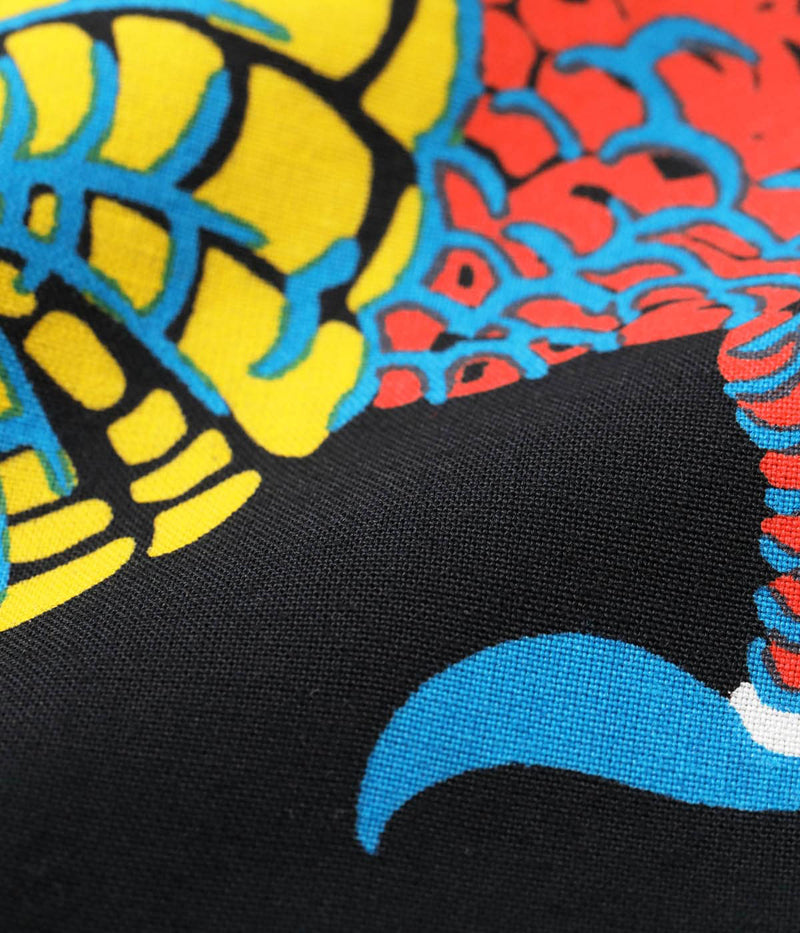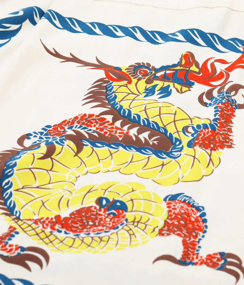 厚手のレーヨン羽二重の生地を使い、ダイナミックにフロントとバックの両面に配されたドラゴンが非常に強いインパクトを放つ一枚。この作品を手掛けたアートヴォーグ・オブ・カリフォルニア社はバックパネル・パターンを得意としていたが、それに通ずるものがあり、アートヴォーグの持つ感性が色濃く反映されたデザインとなっている。中国の元の時代は五本の爪を持ち、頭に二本の角を生やした龍だけが本当の龍であるとされ、皇帝だけが使用できる特別なデザインとされていた。最高の位を意味する龍が海を渡り、アメリカ西海岸でアロハシャツのモチーフとして描かれた時代と文化を超えた大作。