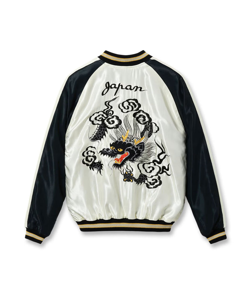 リバーシブル面は、長い胴体を雲間に隠しながら大空を浮遊する龍の絵柄。ブラックを基調とした単色の刺繍だが、顔と鱗の縁取りにグレーの色糸を重ねることで立体感を強調している。風にたなびく龍の鬣(たてがみ)は細いラインの横振り刺繍で繊細に描写。身頃より袖下の色の方が濃い通称「逆配色」と呼ばれる仕様で、白いボディに黒い龍のコントラストが際立っている。