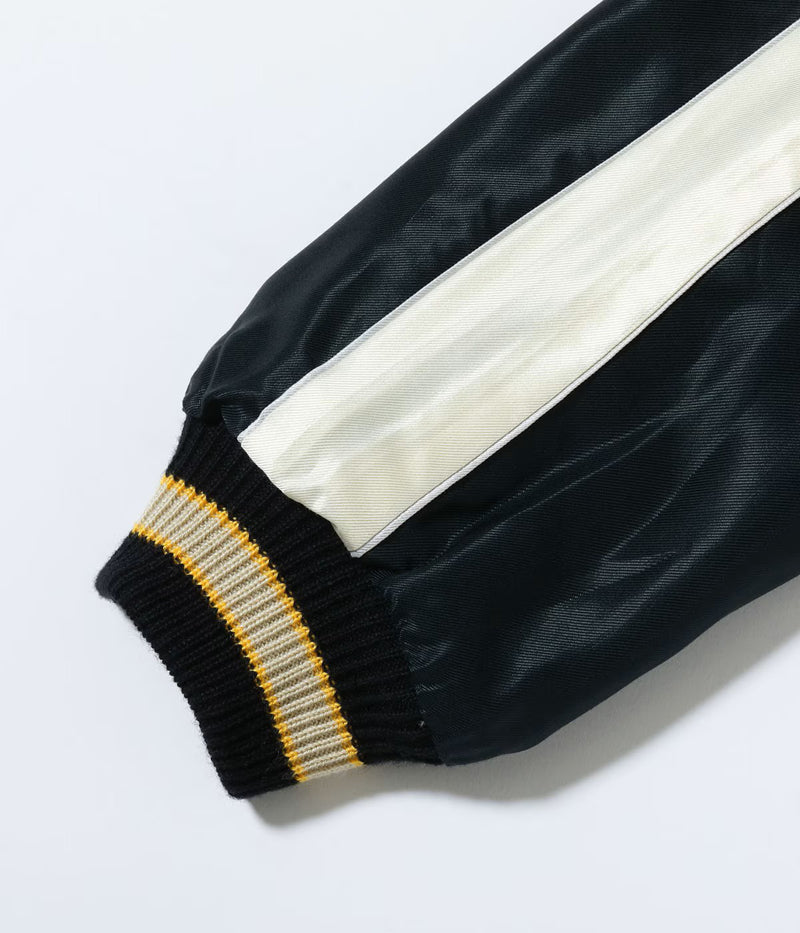 表面はブラック×オフホワイトのモノトーン調のボディに、月夜に咆哮する虎を配した「THE スカジャン」といえる王道の絵柄。1950年代中期の作品をもとに刺繍の針足を駆使して虎の毛並みや筋骨隆々とした体躯を写実的に表現しており、黒いサテン生地に際立つコントラストの強い配色で、迫り来るような迫力を持った躍動感あふれる仕上がりとなっている。背中のJAPANの文字はヴィンテージでも人気の高いオリエンタルなフォントを再現。