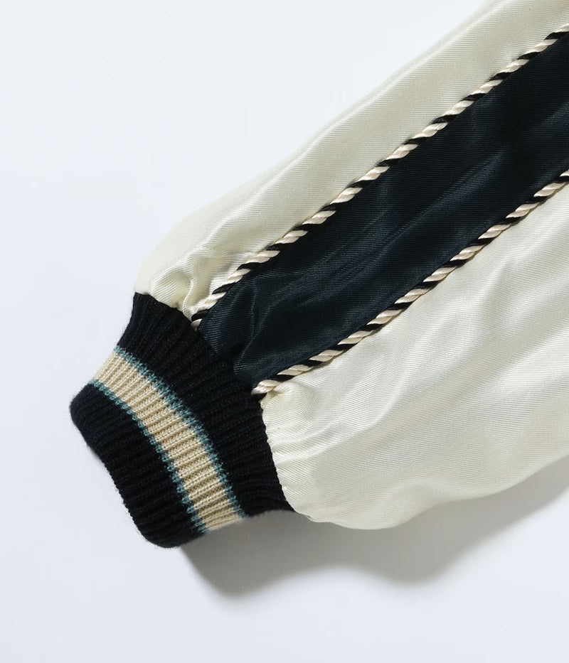 スーベニアジャケットのなかで最もスタンダードな両面にアセテート生地を使ったリバーシブルタイプ。戦後当時のスカジャンには、シルクに似た高級感を持つ物資統制外品目のアセテートが使われていた。中綿がないため季節を問わず着用でき、独特なドレープ感も魅力といえる。