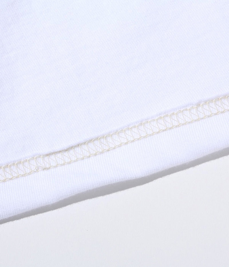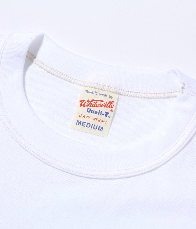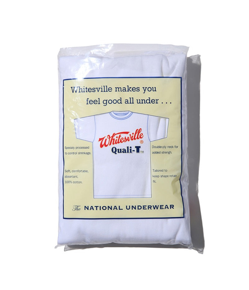 身頃は丸胴仕様で、襟には30番手の糸で編み立てたリブを使用。リブでボディの生地を挟み込み、30番手の糸で編み立てた天竺生地をテープ状にしたものを同時に縫製するダブルバインダーネック仕様を採用している。これにより、通常のTシャツよりも首まわりが頑強な仕上がりとなっている。肩、裾、袖口は2本針の縫製。年間を通して着用可能なこの2パックTシャツは、ホワイツビルのロングセラー商品となっている。