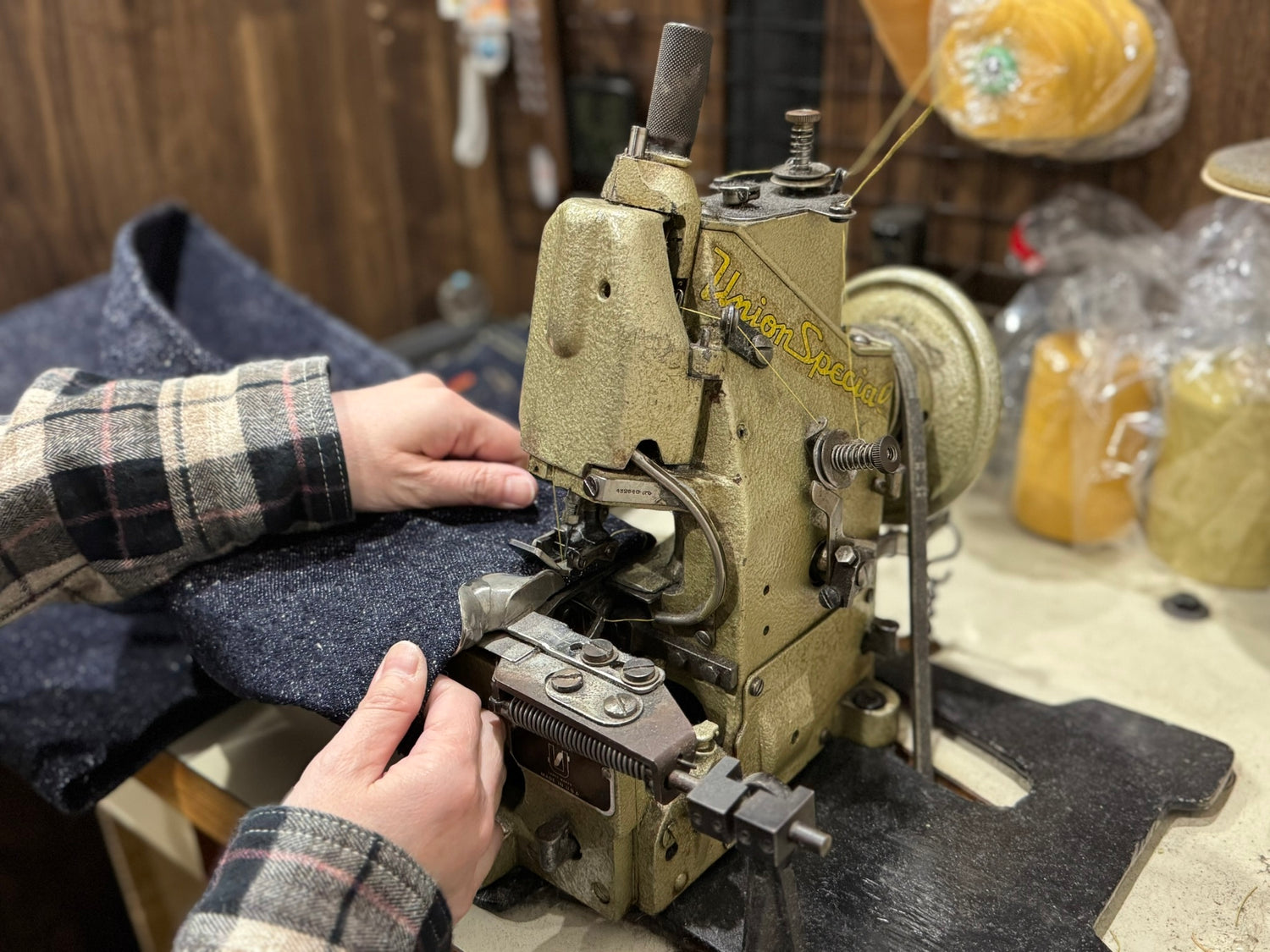 店頭でお買い上げいただいたThe Strike Goldのジーンズにかぎり、追加料金なしでユニオンスペシャル社(Union Special)のミシンによるチェーンステッチでの裾上げが可能です。