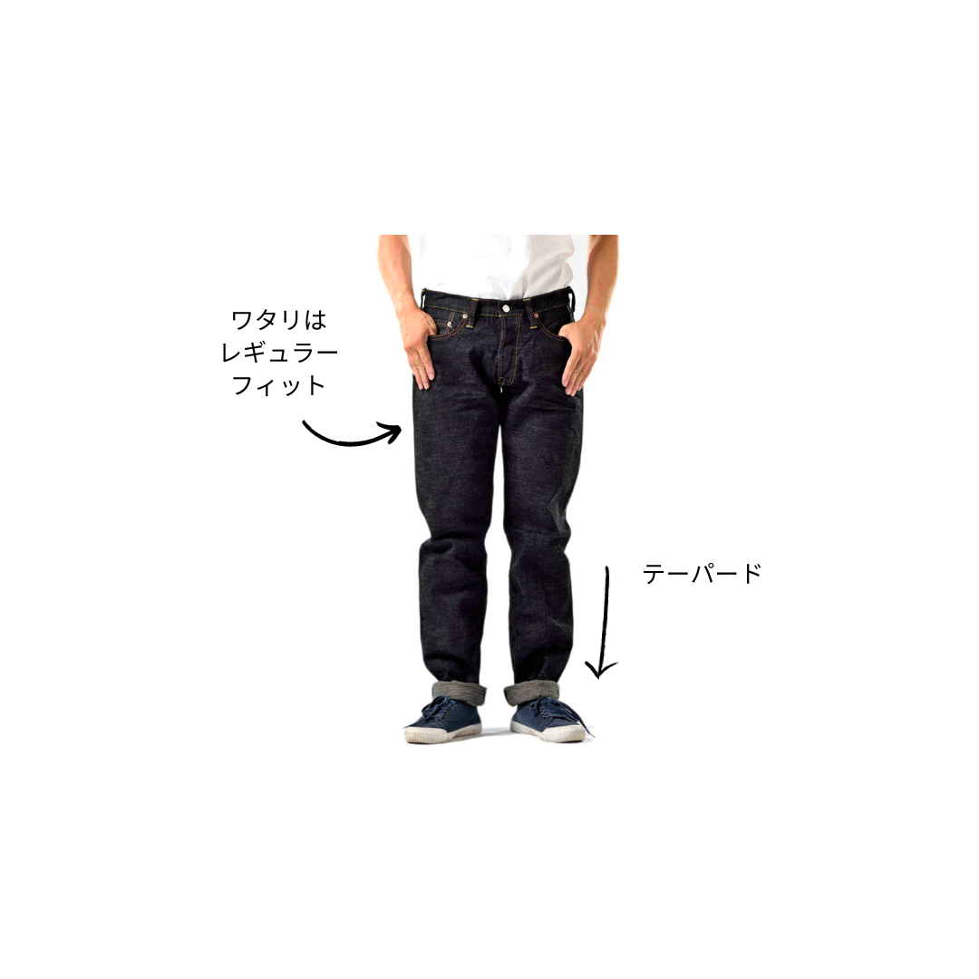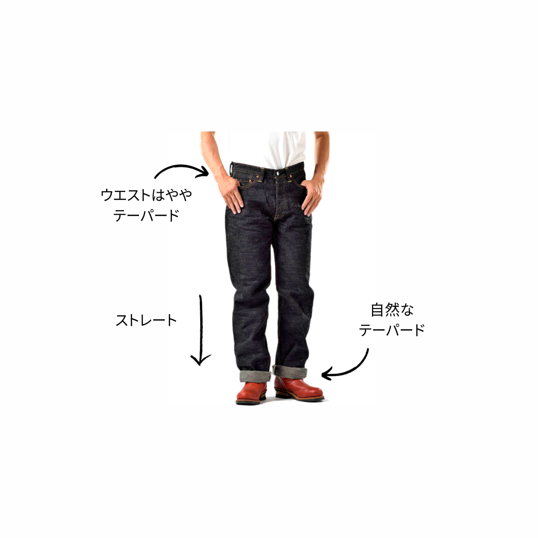 腰周りのもたつきを抑えたクラシックなレギュラーストレート。緩やかで自然なテーパード(裾にかけての絞り)がある為、ベーシックなヴィンテージスタイルが楽しめる。