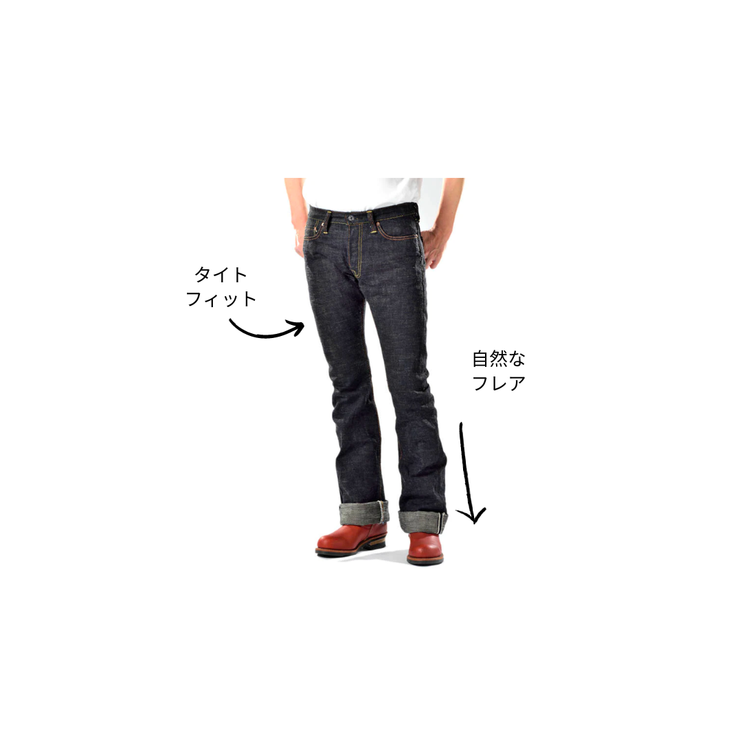 腿から膝にかけてタイトに絞り膝下から自然で美しくフレアさせたオリジナルブーツカット。アウトシームにセルビッチを使い難易度の高いパターンメイキングが生み出すしなやかなフレアカーブはスタイリッシュな立ち姿を実現してくれる。エンジニアブーツやウェスタンブーツとの相性も抜群。