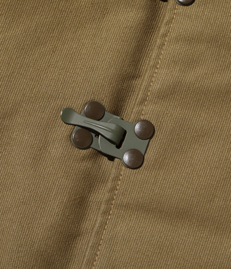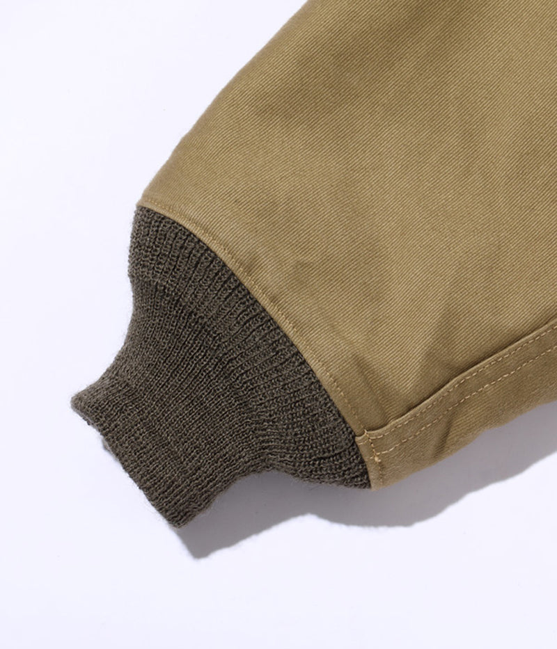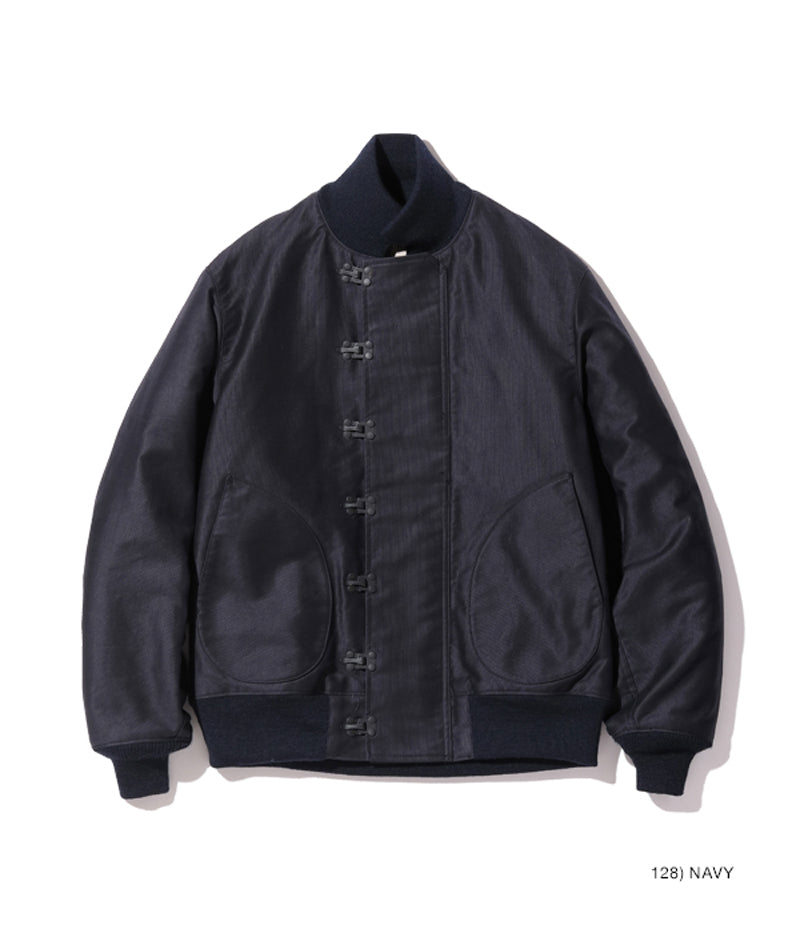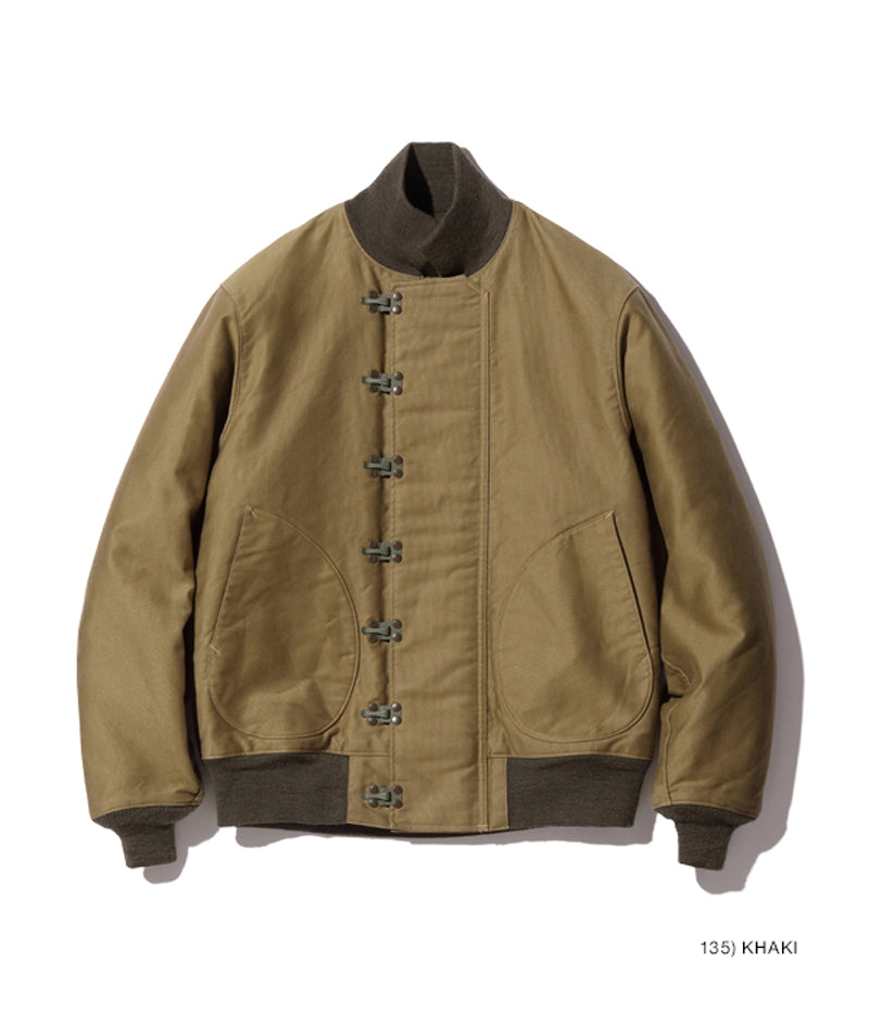 高密度で織り上げられた通称“ジャングルクロス”は、洋上で冷風に晒されるデッキクルー達の身体を守った。初期型のデッキジャケットにはフロント開閉パーツとしてファスナーが採用されていたが、海水の塩分によって錆が生じやすく、後期型はフックタイプに変更された。また、このジャケットの開閉フックには、非常に珍しいプレス式で打ち抜いた真鍮のプレートをリベットで留めたものを使用している。