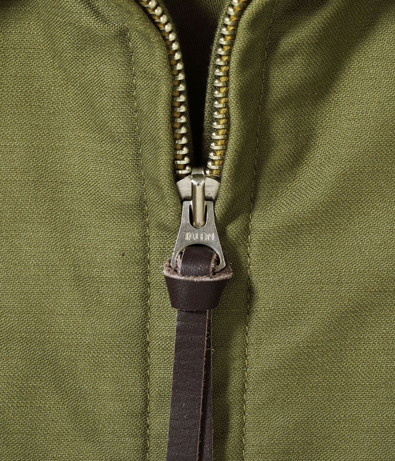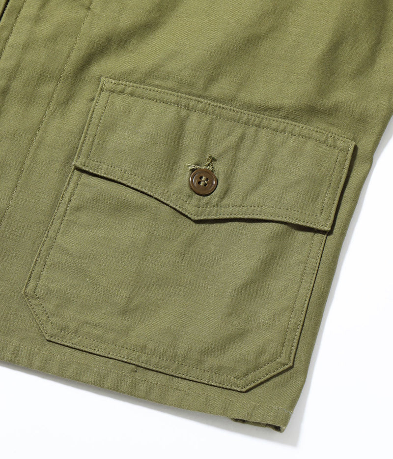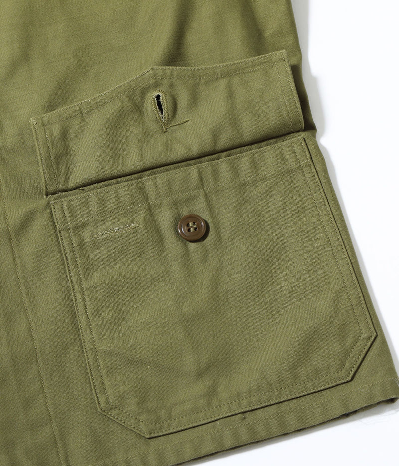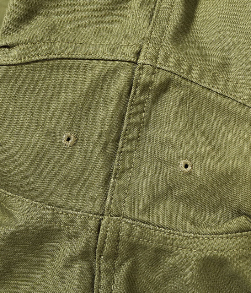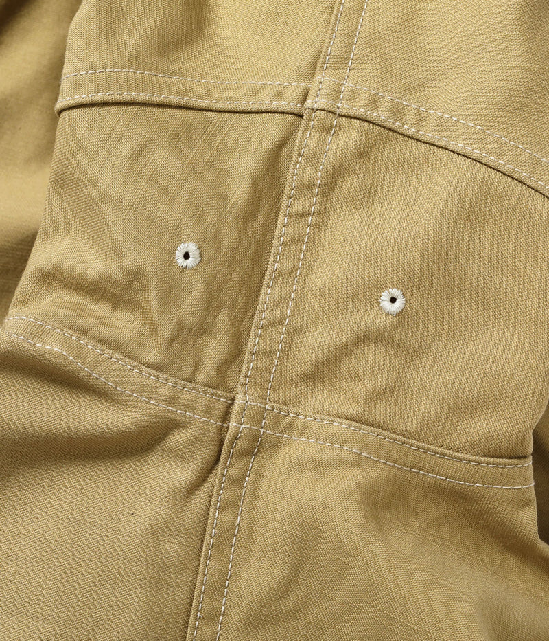 米海軍が1940年から1943年に掛けて薄手のコットン地を用いて製造した夏季用のフライトジャケット、M-421A。このジャケットの表地には高密度で織り上げ、摩擦によって表情に磨きが掛かる厚手のバックサテン地を使用し、短い着丈も見直したM-421Aのモディファイバージョン。米海軍の伝統とも言える運動性に優れた背面のアクションプリーツはそのまま取り入れている。M-421Aは菱形の肘当てが最大の特徴であり、直線で潔いデザインはミリタリー然として非常に魅力的である。このジャケットを製作した真意は、実はそこに隠されている。