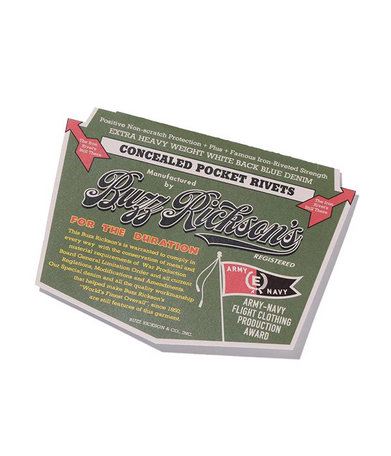 フラッシャーに記されている“FOR THE DURATION”とは『戦争の期間中』という意味で、戦争が終わるまでの間、物資統制による仕様変更の旨が記されている。1940年代、米国政府は優秀な軍需品を手掛けた企業に対してその功績を称えてExcellent(優秀)を意味するEペナントを進呈した。大戦当時、バズリクソンズがフライトジャケットのコントラクターを務め、Eペナントを受賞したという夢のフラッシャーが実現されている。