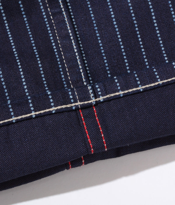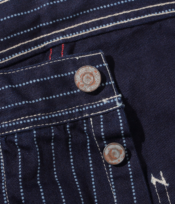 | レイルローダー(鉄道員)たちに愛用されていたウォバッシュ生地のワークパンツ。インディゴで染色した9オンスの生地にドットストライプ柄を抜染(ばっせん)している。型は1930年代のヴィンテージをベースにしており、シルエットはやや太め。発売から10年以上作り続けられているシュガーケーンのロングセラーで、スタイルを問わずコーディネートしやすい。 ディテール詳細 ウエストにはバックストラップを装備。ベルトレスでもウエストの調整が可能となっている。フロントはボタンフライで、経年して錆びた風合いに仕上げた。右のフロントポケットには、ブランドラベルを縫い付けたウォッチポケットを装備。古い年代のワークパンツに見られるポケット口の独特なステッチワークも特徴。 |