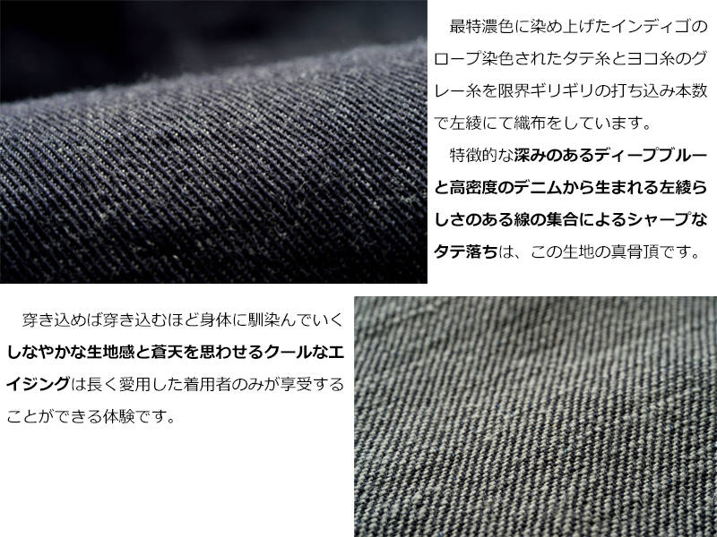 最特濃色に染め上げたインディゴのロープ染色されたタテ糸とヨコ糸のグレー糸を限界ギリギリの打ち込み本数で左綾にて織布をしています。 特徴的な深みのあるディープブルーと高密度のデニムから生まれる左綾らしさのある線の集合によるシャープなタテ落ちはこの生地の真骨頂です。